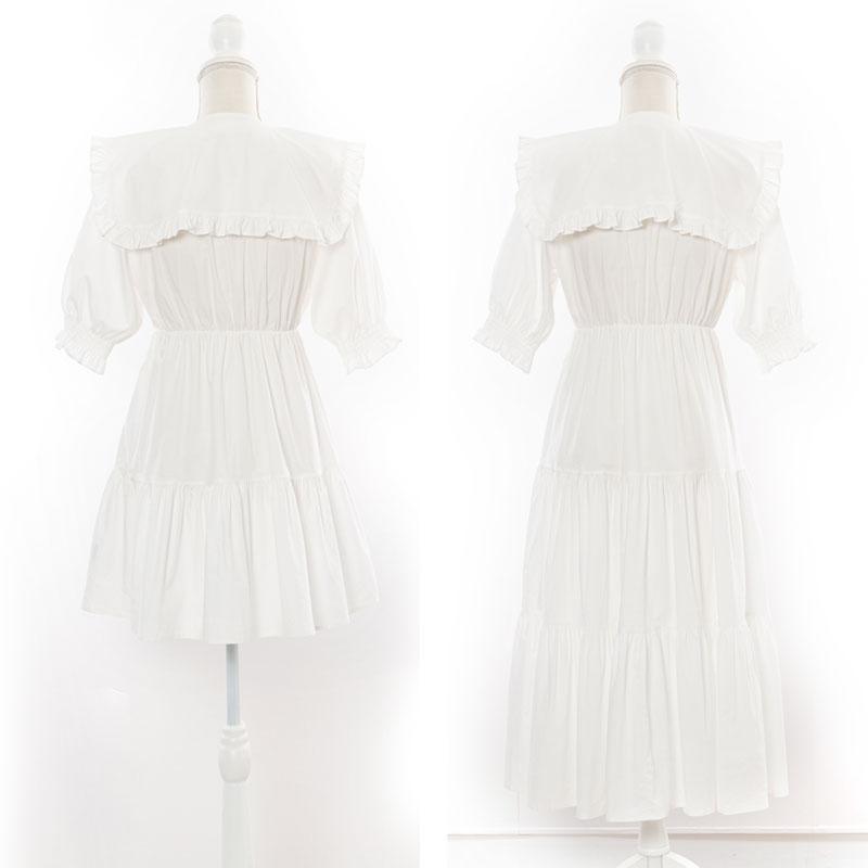 セーラー襟のティアードワンピースのご紹介。【デザイン】ふんわりとしたギャザースカートシルエットがとにかくかわいいワンピースです。ウエスト全体にゴムが入っています。前のボタンを開けて、被りで着ていただく仕様です。ウエストゴムは締め付け感がなく、着心地も良いです。ハートのきらきらビジューボタンがアクセントになっていて、フレンチガーリーや、とびきりドーリーになりたいときにおすすめのワンピースです。【素材】コットン素材のワンピースです。袋に入れた状態でお届けですので、お届け時しわが気になると思いますが、ハンガーにかけていただいたり、アイロンでしわを伸ばしていただくのがおすすめです。スカートに裏地が付いています。光で透ける可能性があるので、インナーの着用をおすすめいたします。【コーディネート】ハーフアップにリボンバレッタや、ハーフツインなど、ガーリーな髪形と相性◎!髪が長くない方も、ふわふわと巻いていただくと可愛く甘めに着ていただけます。撮影ではパンプスを合わせていますが、カジュアルミックスでスニーカーを合わせていただいても可愛いと思います♪《透け感》カラーによってあり 《生地の厚さ》薄手 《裏地》あり 《伸縮性》なし《生産国》中国