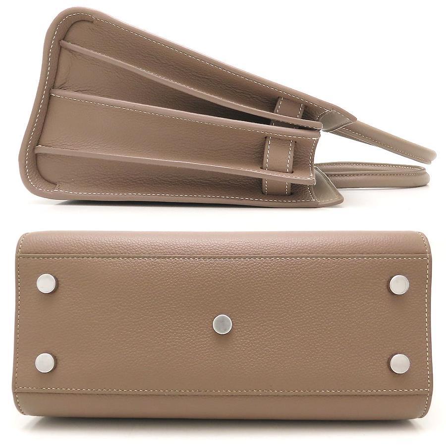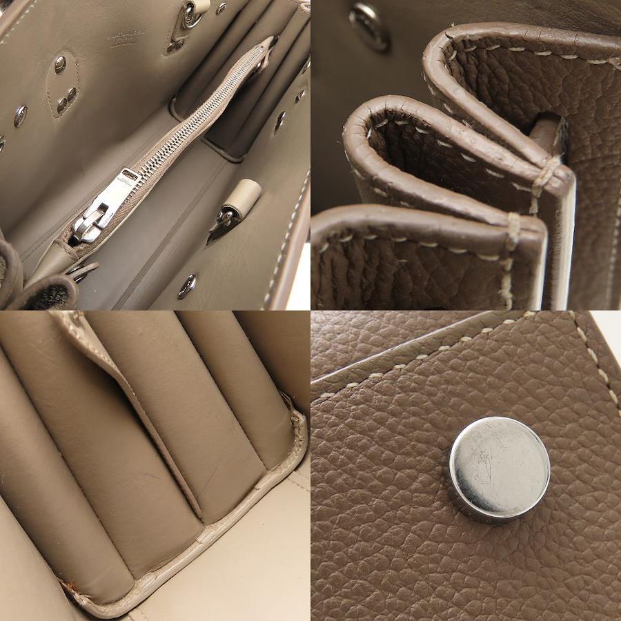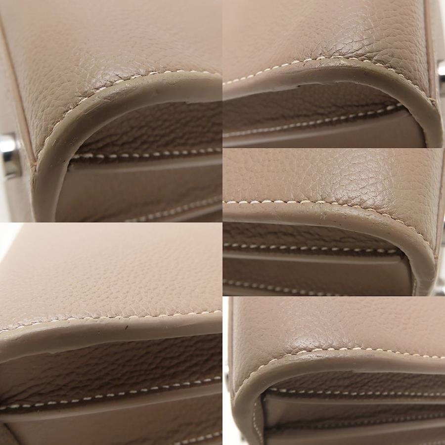 [外・表面] 一部汚れ [外・ハンドル] 根元のコバヒビ割れ [外スト・ショルダー] コバヒビ割れ / コバ凹み [外・角] うっすら汚れ / スレ [外・縁] コバにヒビ割れ / コバにスレ / コバにキズ [外側] ショルダーストラップのフック金具に付着汚れ・キズ・コバヒビ、調整穴に1か所穴増設跡あり [金具部分] キズ / くすみ / 底鋲キズ [内側] スレ / シワ [ファスナー周り] うっすら汚れ / スレ