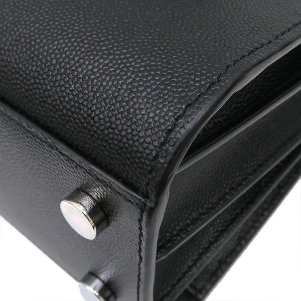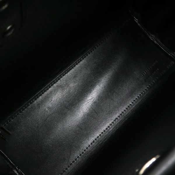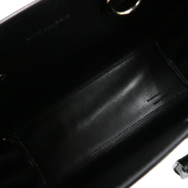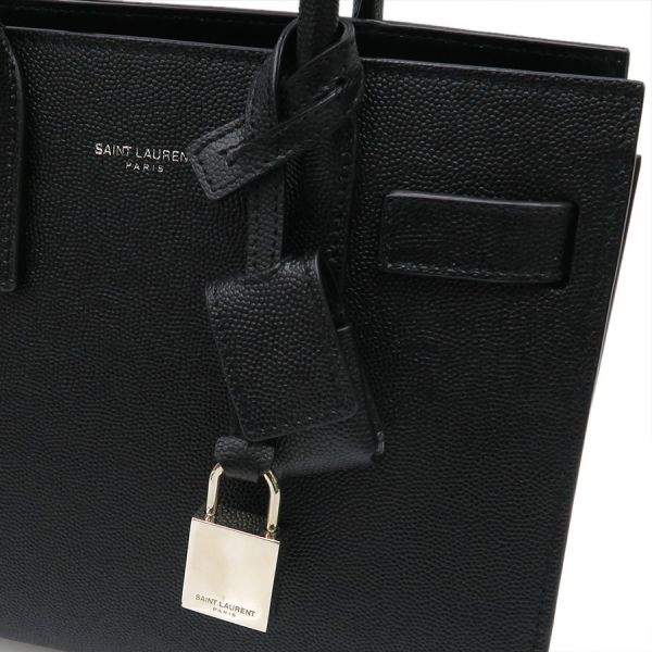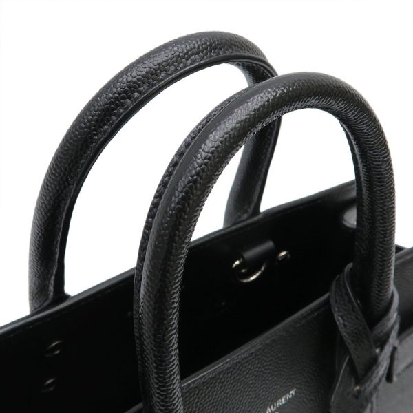 サンローラン・パリのサック ド ジュール ナノのご紹介です!上質のブラックレザーにシルバー色金具を合わせたエレガントな1点! オープン間口で、間口内側にDリングがあり、ショルダーストラップの両端のフックを付けるようになっています。ショルダーストラップはバックル留めで7段階長さ調整可。持ち手に結んであるクロシェットの中は南京錠が入っています。本体表の底部分には鋲が5つあり。☆状態は、本体の型崩れ、表面のスレ・薄汚れ、ロゴプリントのスレ、角や縁のスレ、底鋲のスレ・小傷・くすみ、中のスレ・薄汚れ・香水臭がある程度ですよ!お出かけ用にオススメ!人気商品となりますので、お早めにどうぞ!