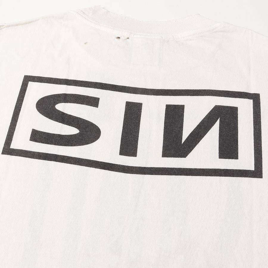 | 商品説明 | ハードなヴィンテージ加工を施したルーズシルエットのクルーネックTシャツです。バックにアメリカのバンド”Nine Inch Nails”のパロディーロゴがデザインされております。 |