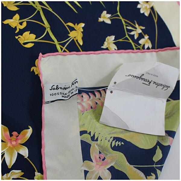 サルバトーレフェラガモ シルク ミニスカーフ 未使用 アイボリー×ネイビー 花 鳥柄 中古 Sランク Salvatore Ferragamo|レディース 女性用 タグ付き