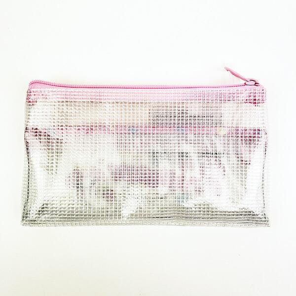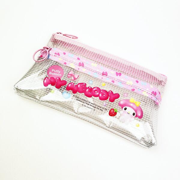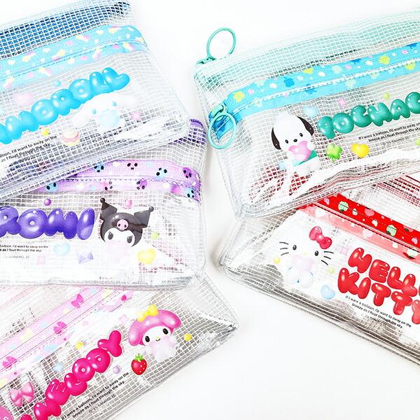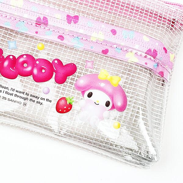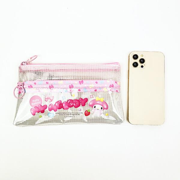 中身が見えるクリア素材にファスナーのデザインが映えるマイメロディのポーチです。2つのポケットで小物を使い分けて収納できてとっても便利◎