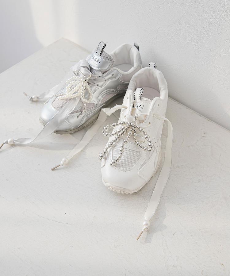 【ディティール】光沢感のあるサテンのリボンシューレースと丸みのあるシルエットが魅力!リボンシューレースの先端にはパールが付属しており取り外し可能◎スニーカーっぽさとフェミニンさを兼ね備えた絶妙なデザインが可愛いポイント。軽量で足にフィットし歩きやすさも抜群。長時間歩いても疲れにくくデイリーシーンにもピッタリな1足です。