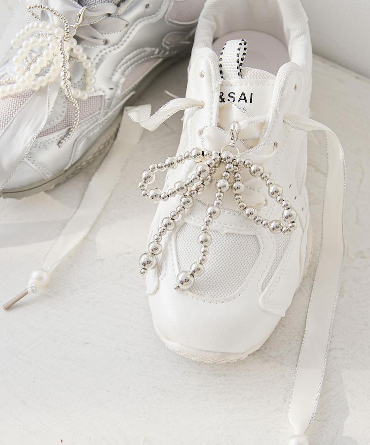 【ディティール】光沢感のあるサテンのリボンシューレースと丸みのあるシルエットが魅力!リボンシューレースの先端にはパールが付属しており取り外し可能◎スニーカーっぽさとフェミニンさを兼ね備えた絶妙なデザインが可愛いポイント。軽量で足にフィットし歩きやすさも抜群。長時間歩いても疲れにくくデイリーシーンにもピッタリな1足です。