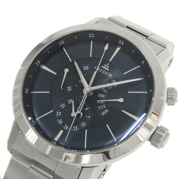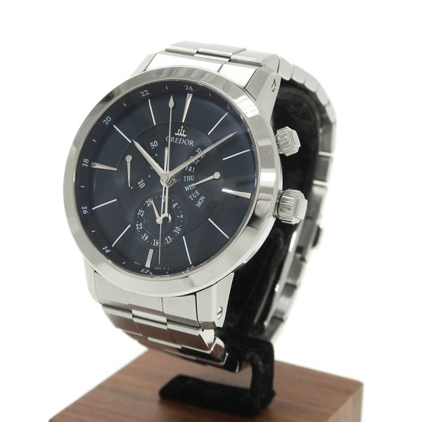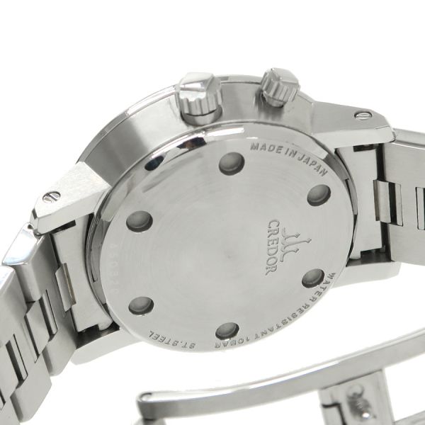 天文学用語で 「地球上から見た月の軌道と太陽の軌道の交点」の意味を持つクレドールのノード。スポーティーでありながら上品な佇まいは、高級時計ならではの手の込みようです。ステンレスのケースやブレスレットにダークネイビー文字盤の色使いには落ち着きを感じます。普段使いはもちろん、ビジネスシーンにも最適で、長く愛用出来る大人の為の1本です。当社提携の時計修理工房にて機械点検を行っております。ベゼルやケース全体に傷、裏蓋に擦れ、ブレスレットに傷がございます。セイコーの人気モデル クレドールをお見逃し無く。