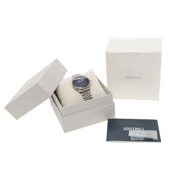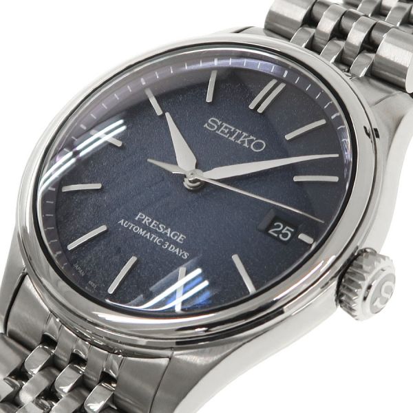 日本の伝統技術を腕時計に落とし込んだセイコー ・プレザージュが入荷しました。日本を象徴する深い青色(藍色)ダイアルで着け心地の良さを究めたクラシックなブレスレットデザインです。シースルーバック 保証書の日付が2025年10月だった為あえて当社ではメンテナンスは行っておりません。