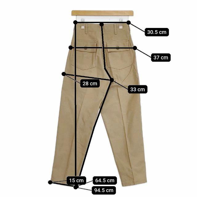 | 実寸サイズ | 総丈:約94.5cm ウエスト:約30.5cm 股上:約33cm 股下:約64.5cm ヒップ:約37cm ワタリ幅:約28cm 裾幅:約15cm ※採寸画像がある商品はハンガーに吊るした状態での計測のため、平置きでの採寸とは差が生じる場合がございます。平置きでの実寸サイズをご希望の場合は、ご購入前に必ずご質問ください。 ※記載以外のサイズが合わないことを理由とした返品はできませんので、 記載部分以外で実寸サイズの気になる箇所があれば必ず購入前にご質問ください。 |