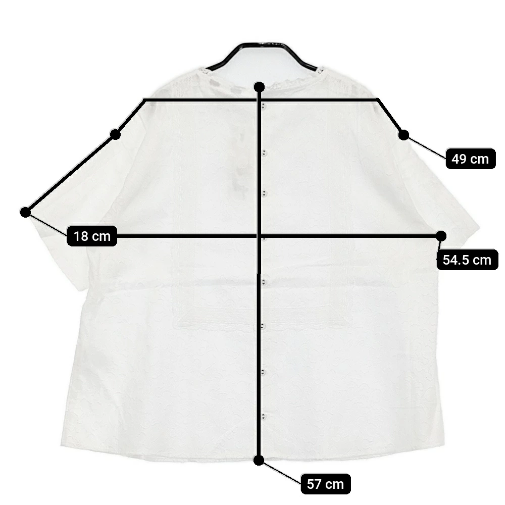 | 実寸サイズ | 肩幅:約49cm 着丈:約57cm 身幅:約54.5cm 袖丈:約18cm ※記載以外のサイズが合わないことを理由とした返品はできませんので、 記載部分以外で実寸サイズの気になる箇所があれば必ず購入前にご質問ください。 |