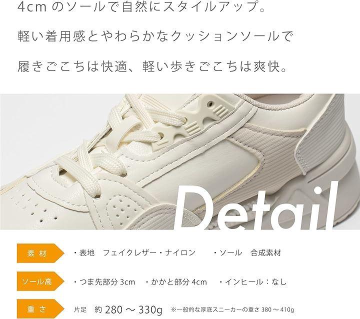 素材:「表地」フェイクレザー(PU) 「裏地・中敷き」ナイロンメッシュ ソール:合成ゴム ソールの高さ:4cm 重さ:片足あたり280~330g