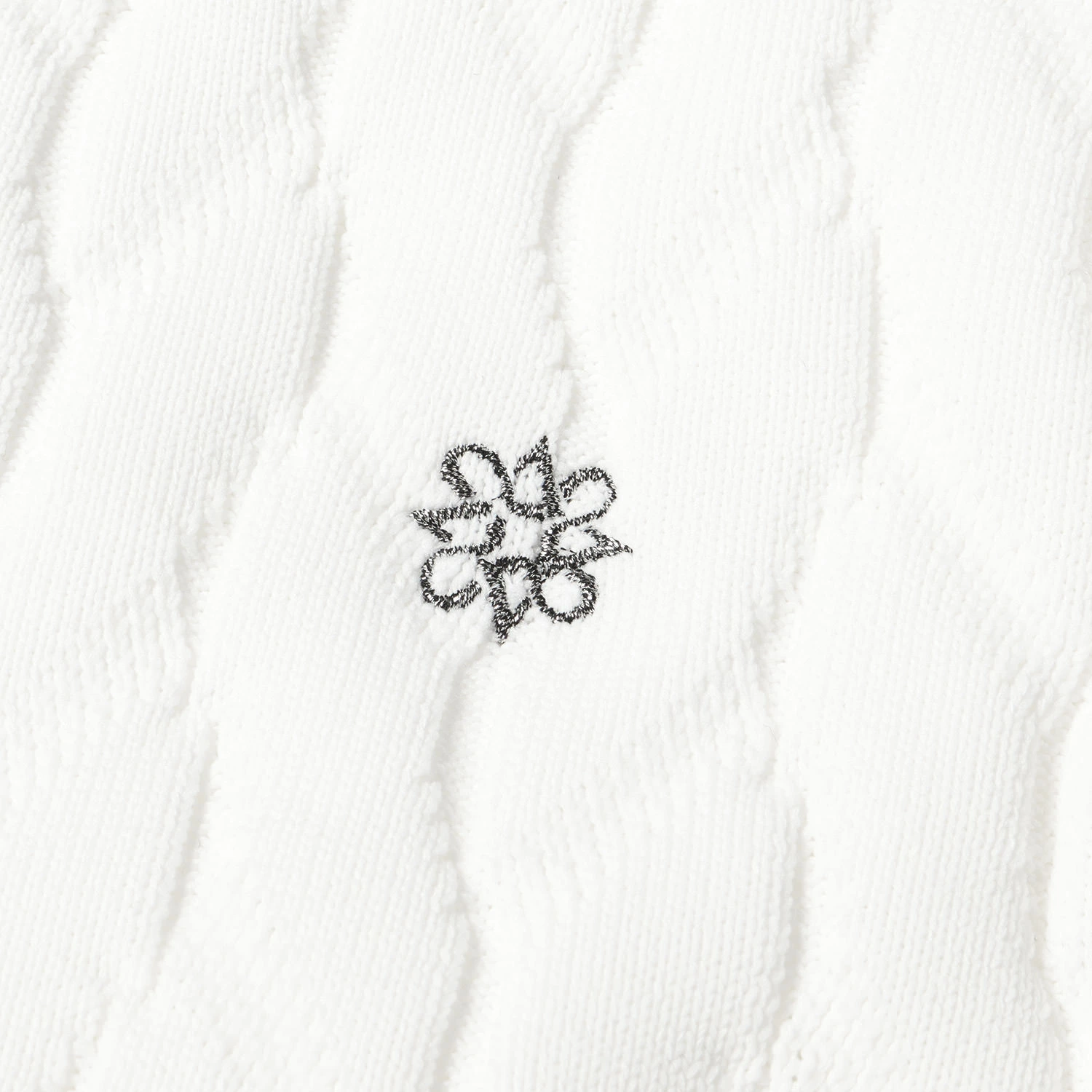 伸縮性のあるポリエステルニット生地を使用し、身頃のみケーブル編みデザイン、左胸ワンポイントブランドアイコン刺繍が配されたクルーネックニットです。