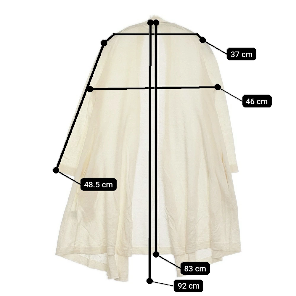 | 実寸サイズ | 肩幅:約37cm 着丈:約83cm 着丈(前):約92cm 身幅:約46cm 袖丈:約48.5cm 備考 身幅おおよそ ※採寸画像がある商品はハンガーに吊るした状態での計測のため、平置きでの採寸とは差が生じる場合がございます。平置きでの実寸サイズをご希望の場合は、ご購入前に必ずご質問ください。 ※記載以外のサイズが合わないことを理由とした返品はできませんので、 記載部分以外で実寸サイズの気になる箇所があれば必ず購入前にご質問ください。 |