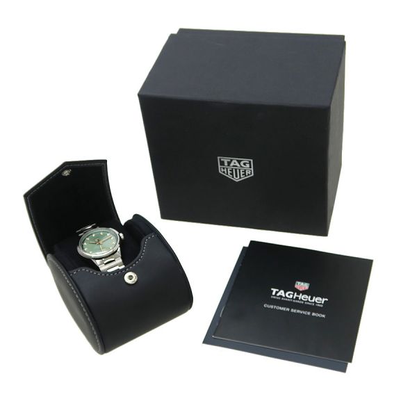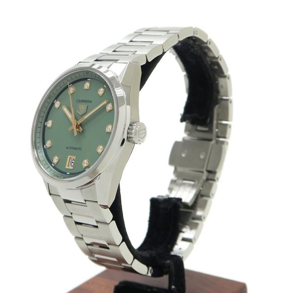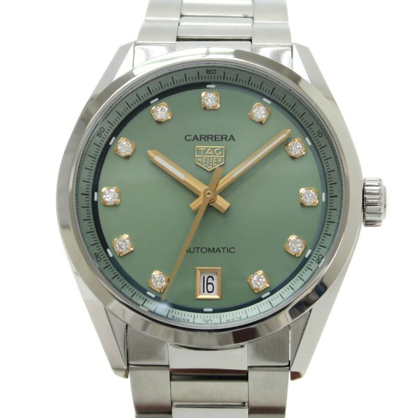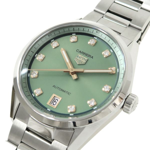 自然の息吹を感じるようなグリーンの文字盤はサンレイ加工とサテン仕上げを施され、ピンクゴールドカラーの針や煌めくダイヤモンドインデックスに良く似合います。ラグジュアリーで上品なタグ・ホイヤー カレラ デイトに、シグネチャーのタッチを添えています。シースルー仕様の裏蓋から覗くキャリバー7自動巻ムーブメントは56時間のパワーリザーブを誇ります。都会のスタイルにふさわしいクラシックなタイムピースです。当社提携の時計修理工房にて外装の仕上げと機械点検を行っております。気になる傷や目に付く傷のない良好なコンディションです。タグホイヤーの人気モデル カレラをお見逃し無く。