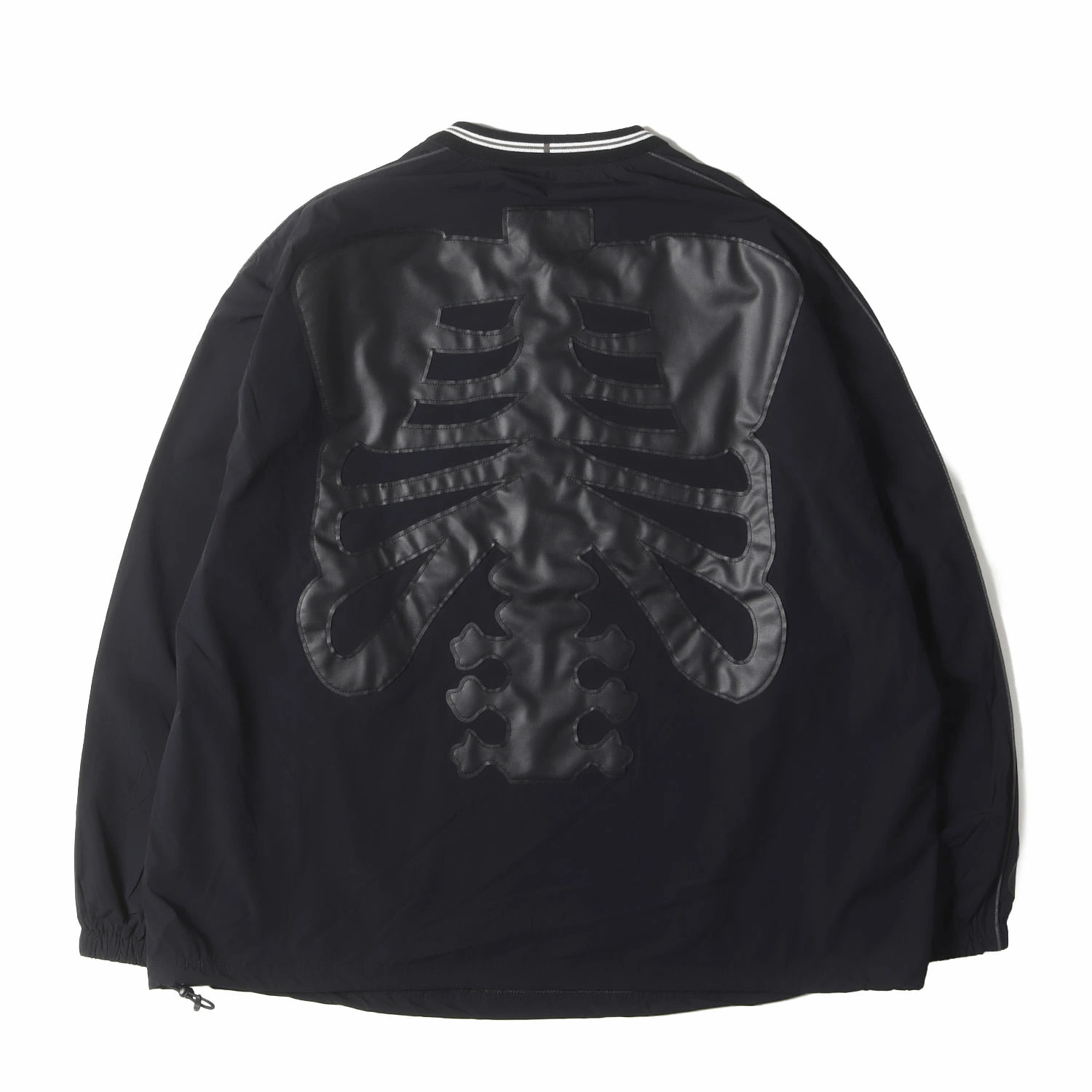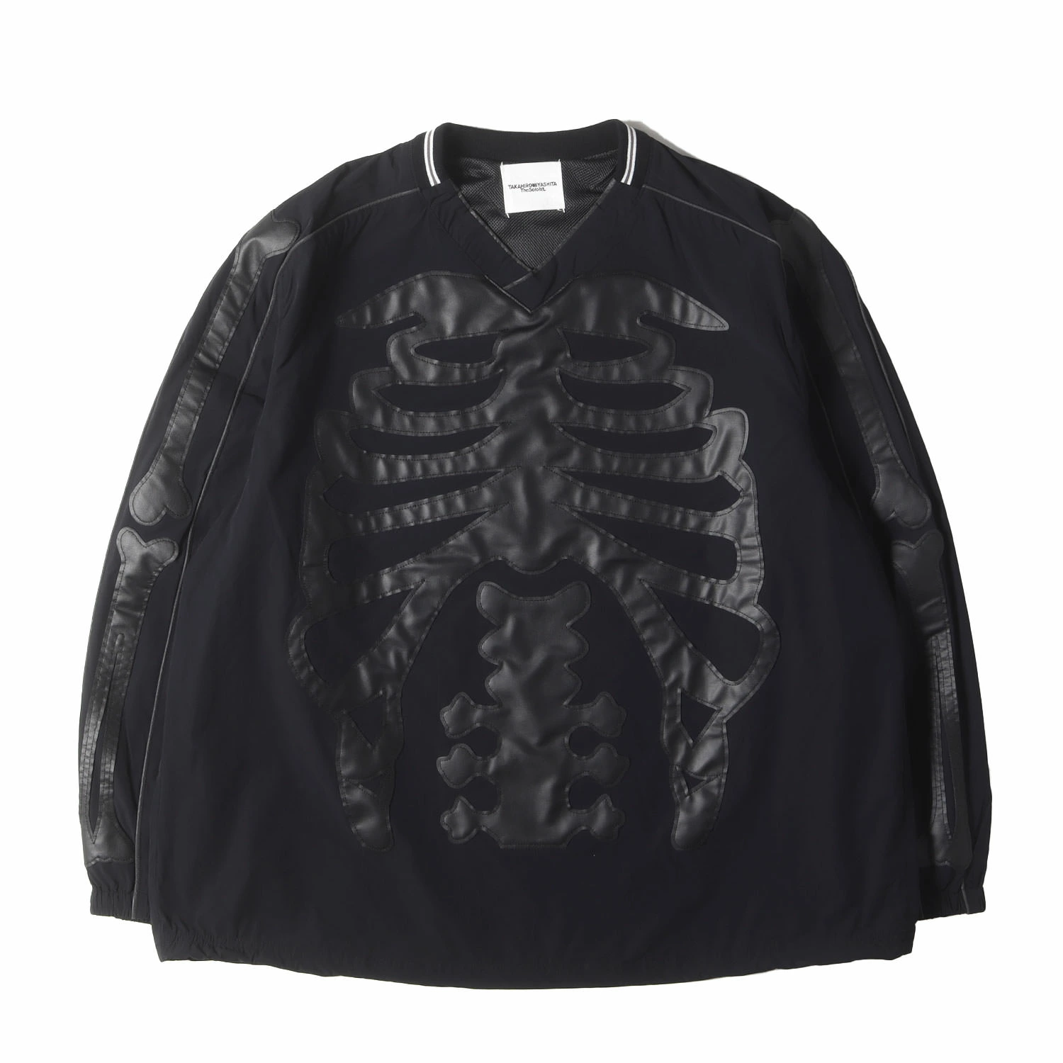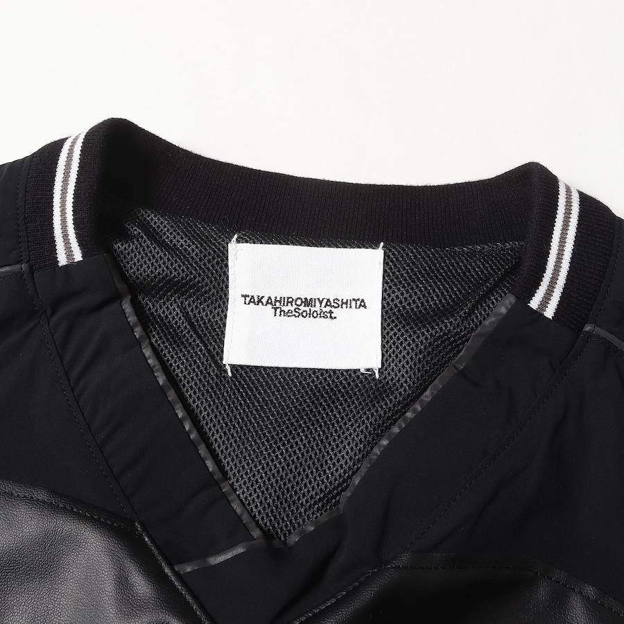 | 商品説明 | ストレッチナイロン素材を使用した裏地メッシュ付きのVネックフットボールシャツです。フェイクレザーのボーンパッチをデザインしたオーバーサイズシルエットの一枚になります。 |