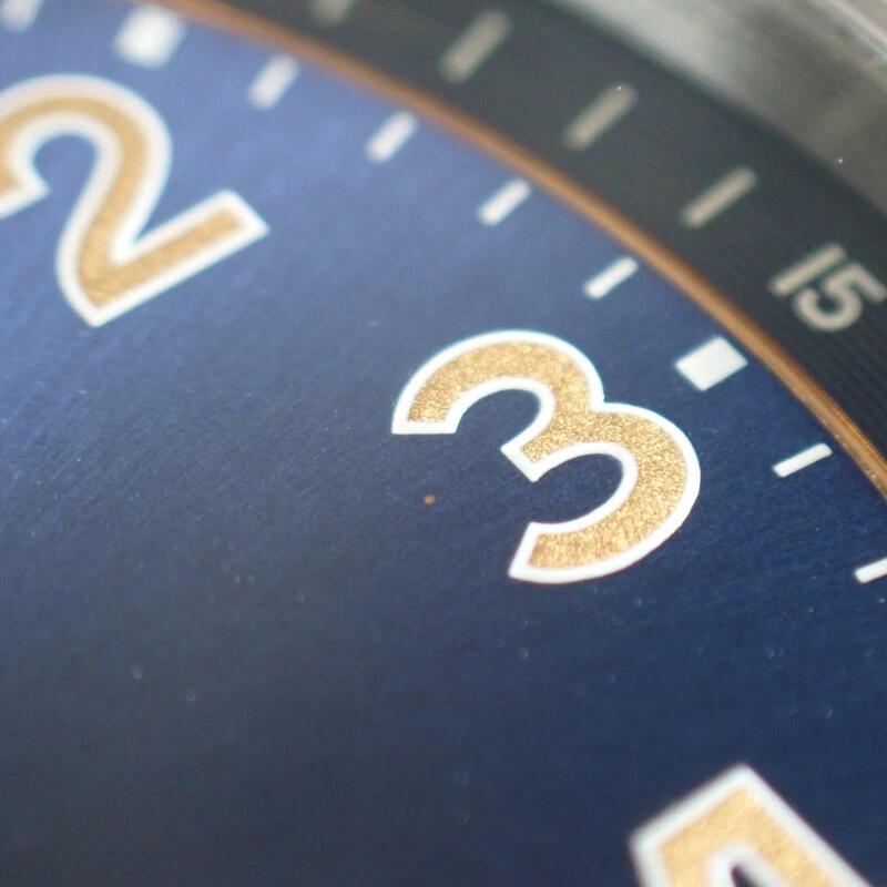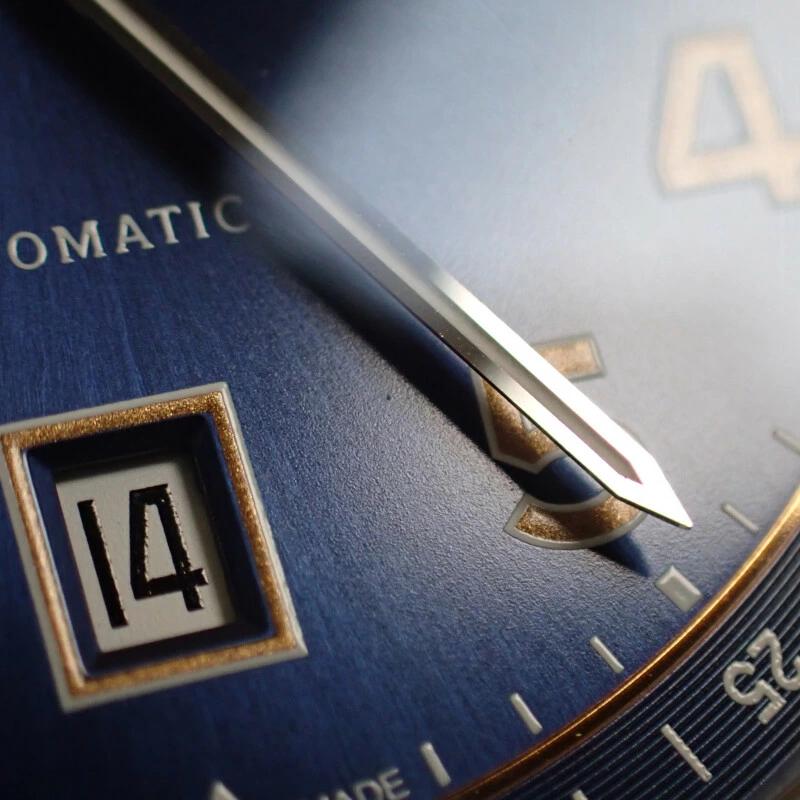 視認しやすい文字とデイト表示に加え、ゴールドのインデックスがより引き締まった印象を与える大変おすすめの逸品です。