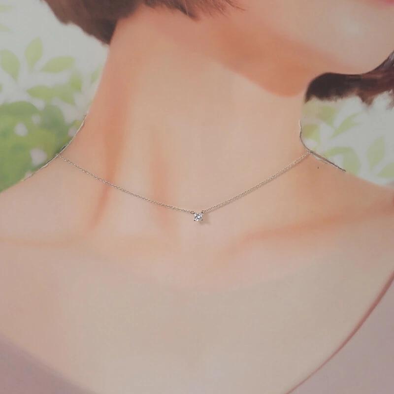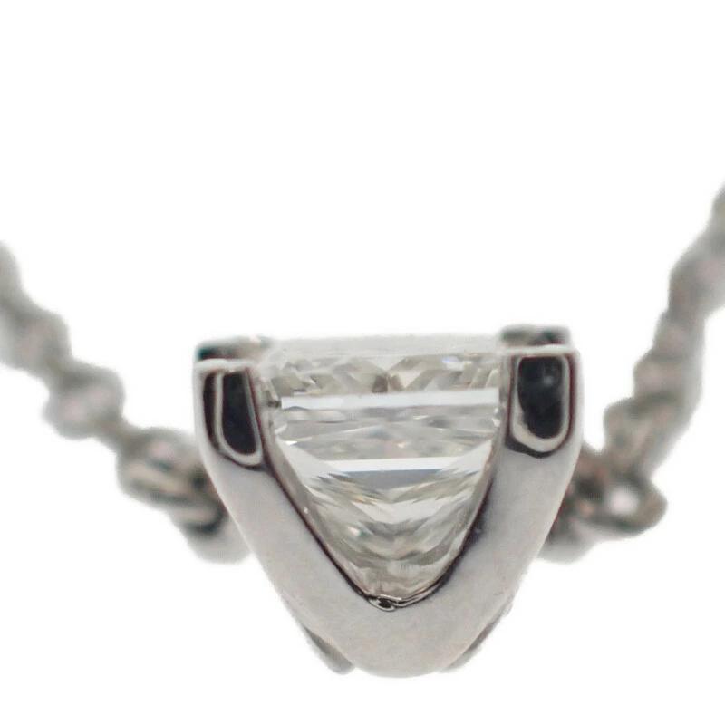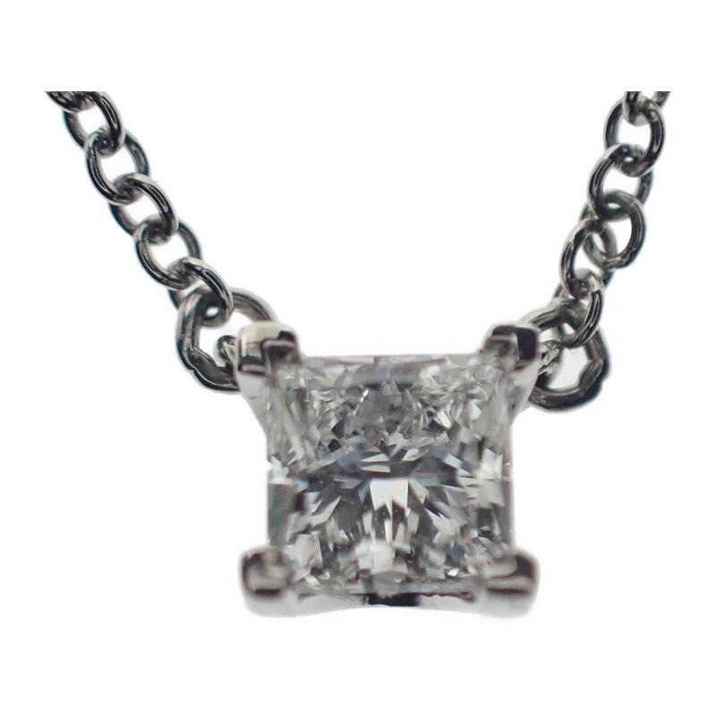 プラチナの気品ある輝きと、プリンセスカット特有のシャープでモダンなシルエットが、胸元に洗練された存在感を添えます。