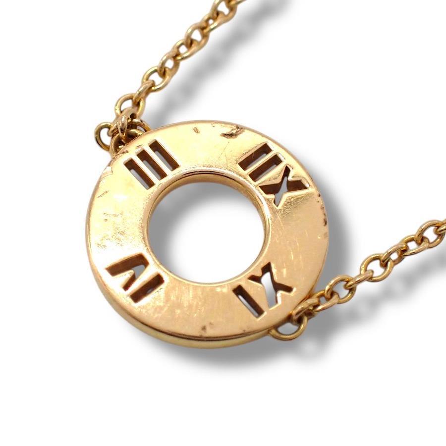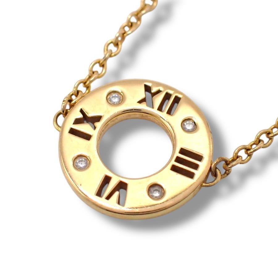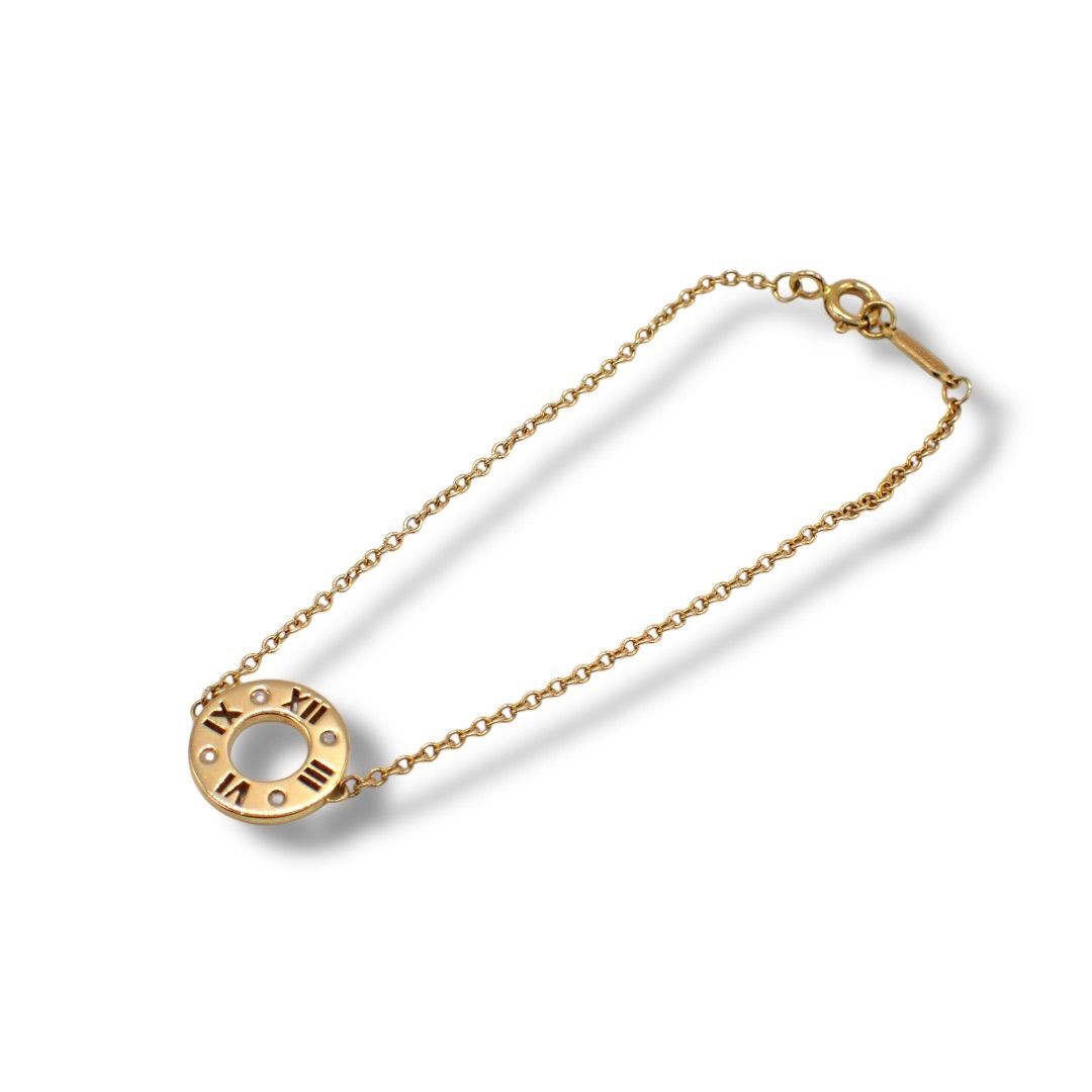 [Brand]TIFFANY[Size]Wrist Circumference: Approx. 15.5cmMotif Width: Approx. 12.1mmWeight: Approx. 2.5gChain Length: Approx. 16cm[Product Description/Condition]Tiffany's iconic "Atlas" collection.This high-end bracelet features an 18K yellow gold bangle (or chain) engraved with sophisticated Roman numerals, accented by four evenly spaced diamonds.The timeless, modern design symbolizes the confidence and elegance of an independent woman.While the base metal shows signs of wear, including scratches and dents, the four diamonds still radiate a vibrant brilliance consistent with Tiffany standards.The rich luster of 18K gold and the sparkle of the diamonds are still intact, making this piece perfect for those who want to enjoy the finest jewelry every day.