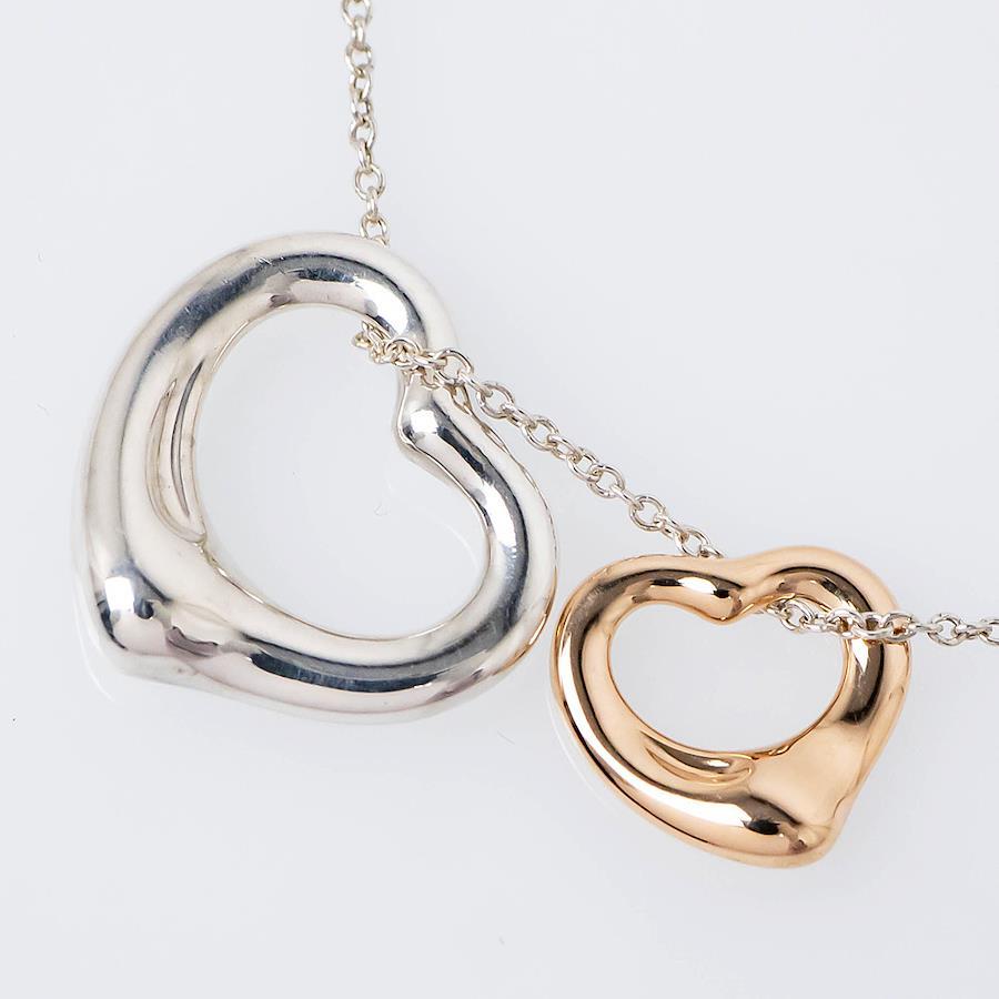Item Rank: ABCondition: This is a used item.Some signs of wear and minor scratches are visible.Ultrasonic cleaning has been performed.Please refer to the images to determine the condition, but please feel free to ask any questions or contact us with any concerns.*The texture and color may appear differently from the actual product depending on the shooting environment and your monitor settings.Brand: TIFFANYProduct Name: Elsa Peretti Open Heart Pendant NecklaceModel Number:Serial Number:Stamp: TIFFANY & Co. / Elsa Peretti / 750 / 925 / SPAINMaterial: 18K Rose Gold / AG925 Sterling SilverStone:Color: Gold / SilverSize: Chain: Approx. 40.5cmMotif: Approx. AG925: W16mm x H14.2mm / 18K: W11mm x H9.8mmWeight: Approx. 4.1gPrice:Accessories: Original box, original drawstring bag*The items shown in the images are all included.