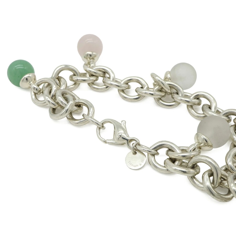 重厚感のあるシルバーのラウンドリンクチェーンに、グリーン、ブルー、ピンク、そしてフロスト加工された半透明のストーンチャームが揺れるアイコニックなデザインがお洒落なティファニーのブレスレットです。