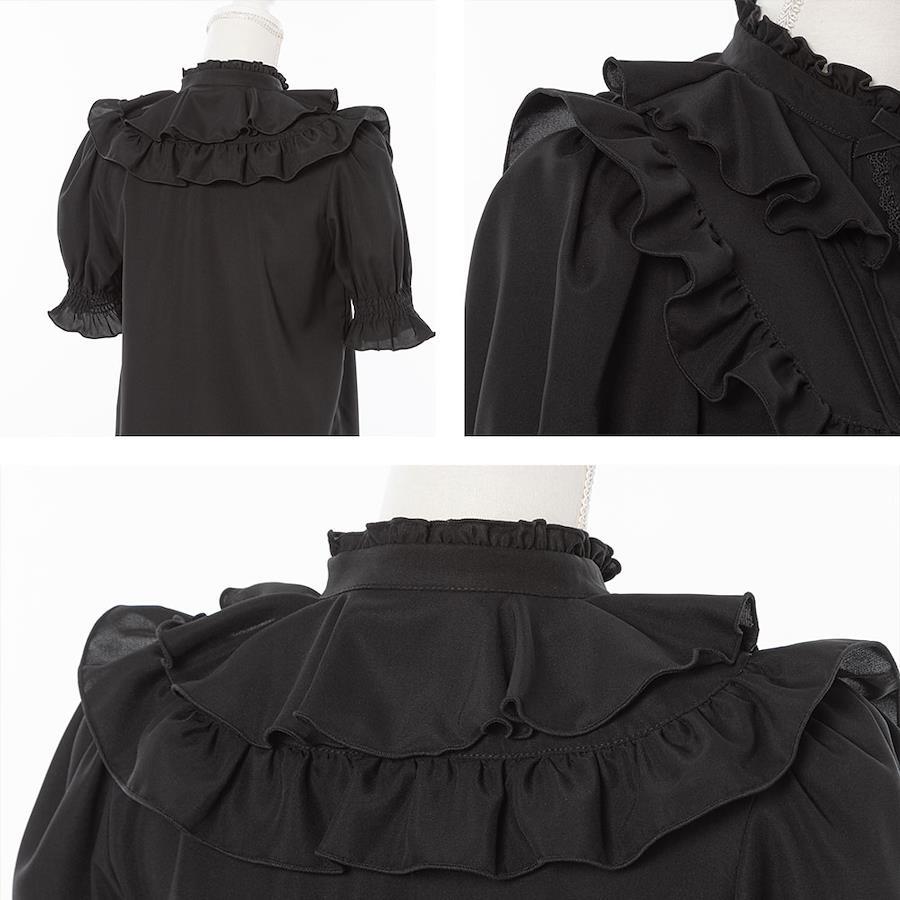 フリルたっぷりのかわいいヨークフリルデザインブラウスのご紹介♪【デザイン】トリプルリボンがアクセントになった、まるでメイドさんのようなヨークフリルブラウスです。前立てのリボン部分裏のみスナップボタンになっており、それから下はパール釦を開けて着用する仕様になっています。リボンやフリルのメロウ、スカラップレースの配色がコーデにアクセントに♪袖口はゴムになっているので、ストレスフリーな着心地です◎可愛いディテールを沢山詰め込んだので、写真映えも間違いなしのアイテムです!