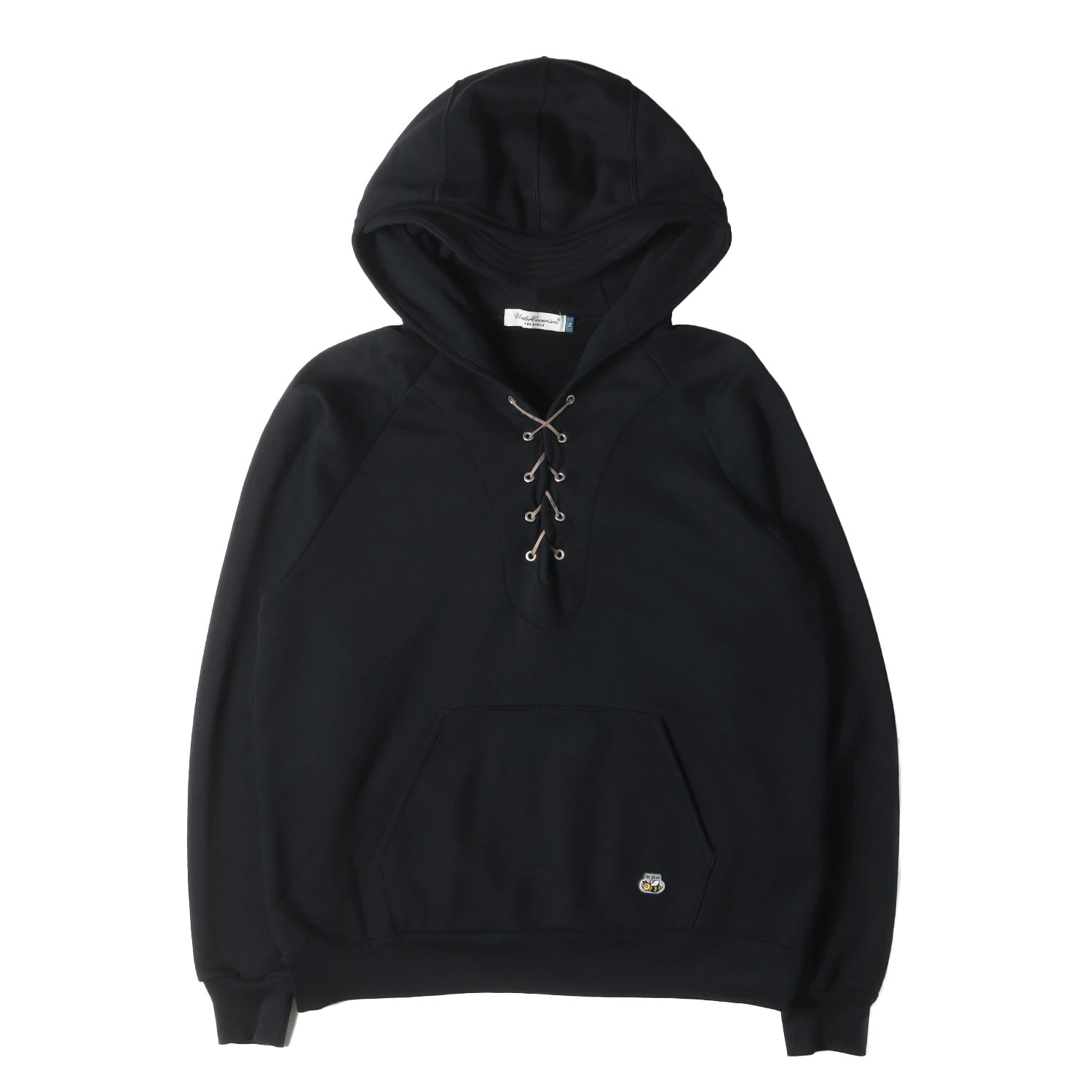 商品説明レースアップで仕上げた裏毛スウェットのプルオーバーパーカーです。ポケットにはハチワッペンがデザインされています。