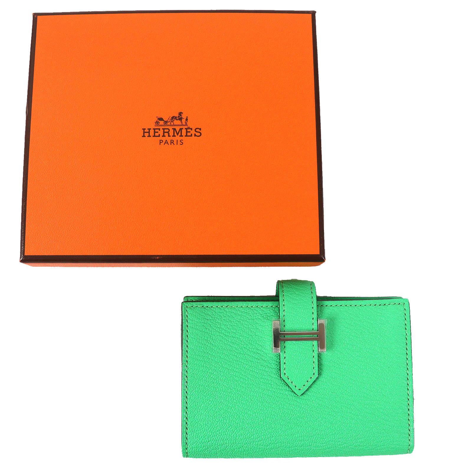 Unused △ HERMES Bearn Mini Vert Comic Silver Hardware Chevre Mysore Bifold Card Case/Business Card Holder Green B Engraved Box Made in France Women's Highly Recommended◎ [Pre-owned]