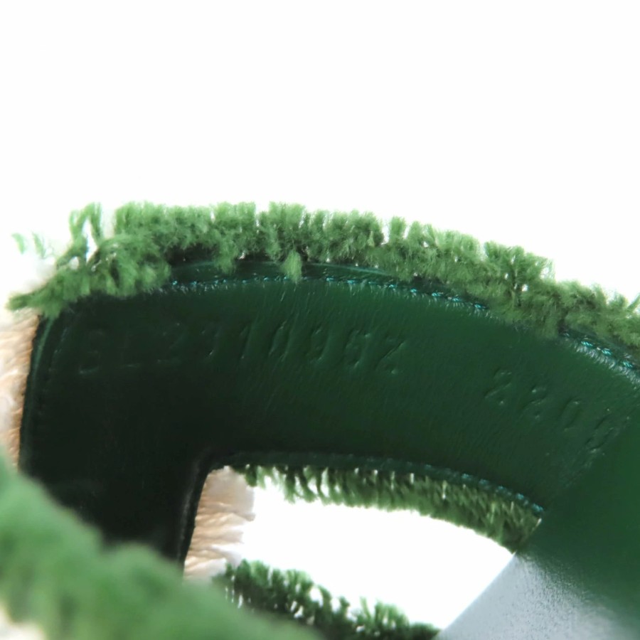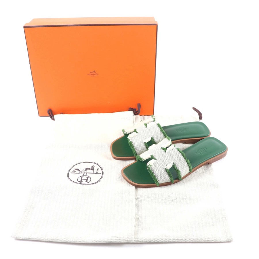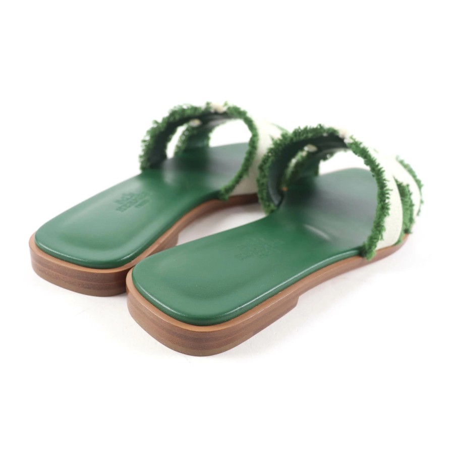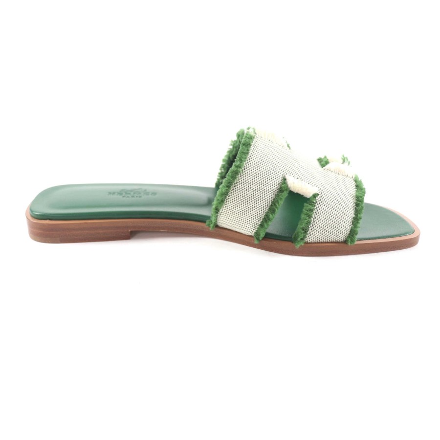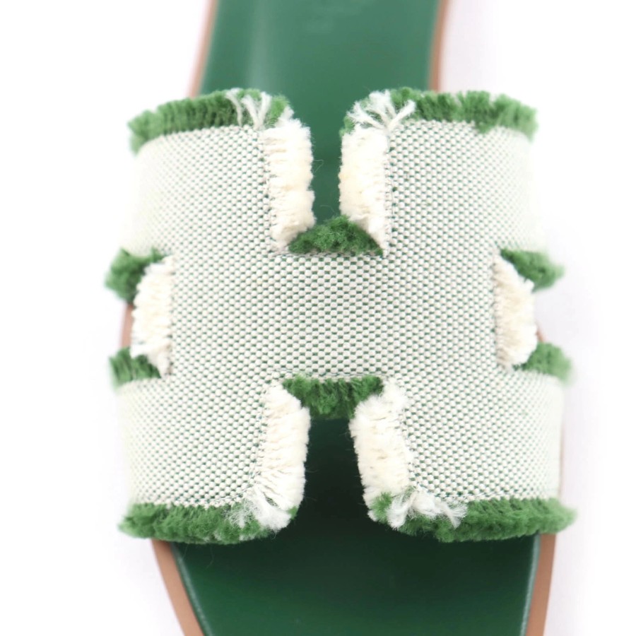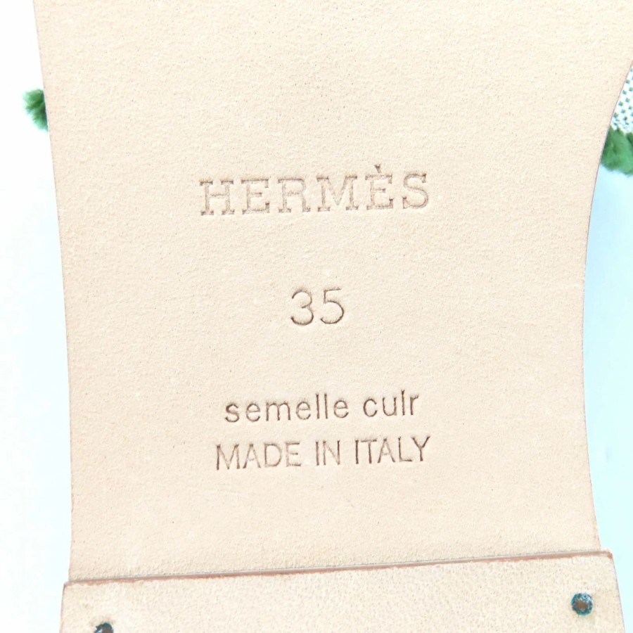 Unused ★HERMES Oran Fringe Canvas Leather Sandals Green 35 With Box and Dust Bag Made in Italy Women's [Pre-owned]