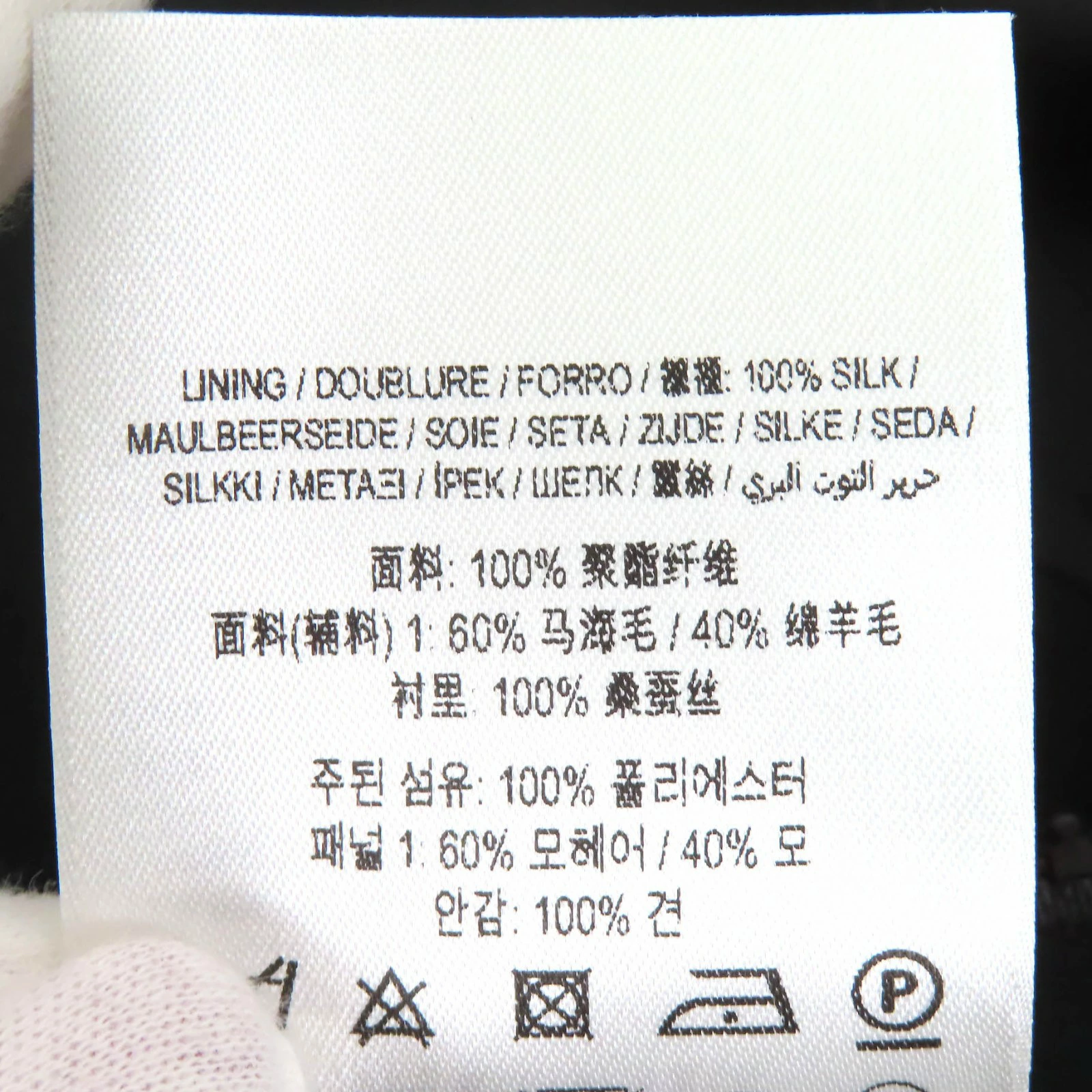 | 素材 (material) | 本体:ポリエステル100% 表地:モヘア60% :ウール40% 裏地:シルク100% | ||||||||||||||||
