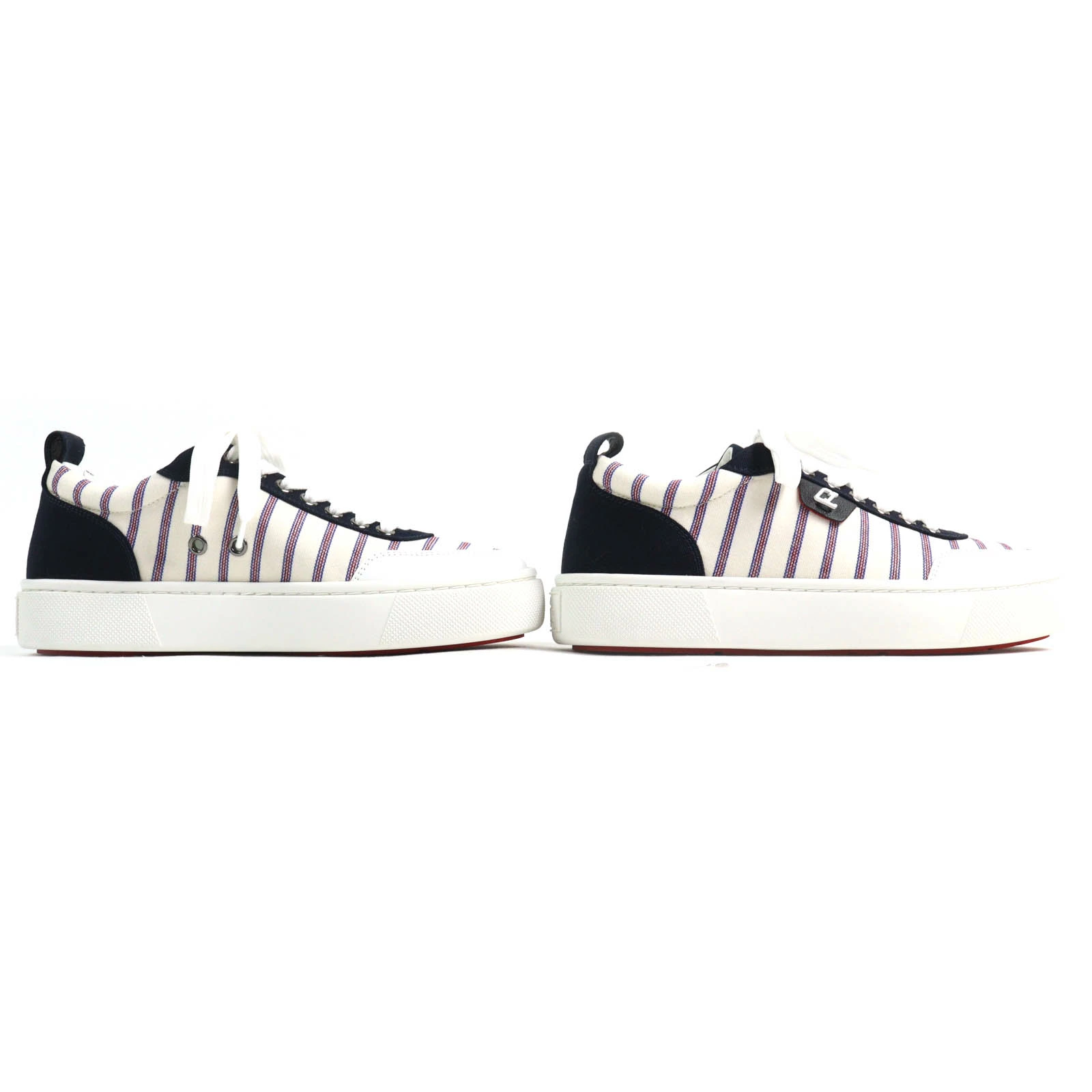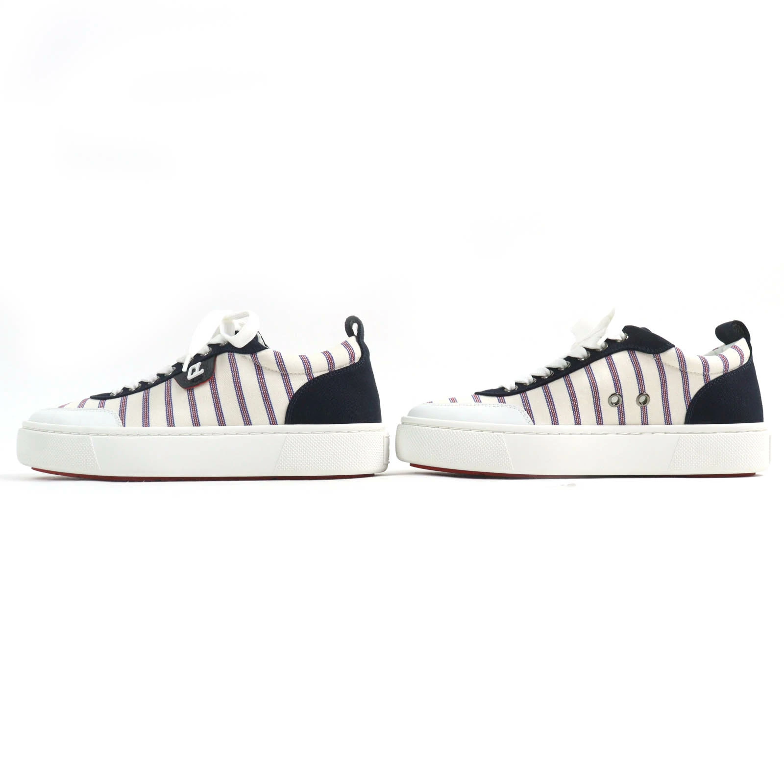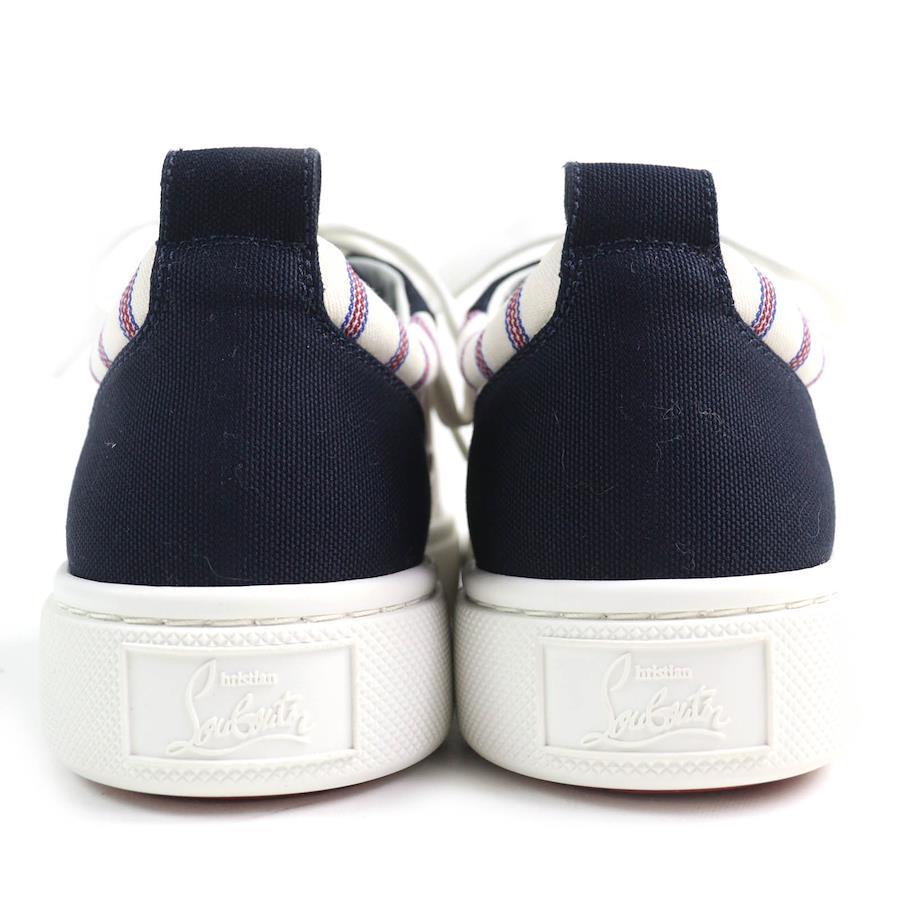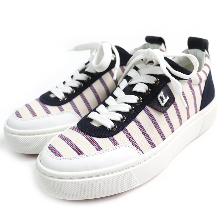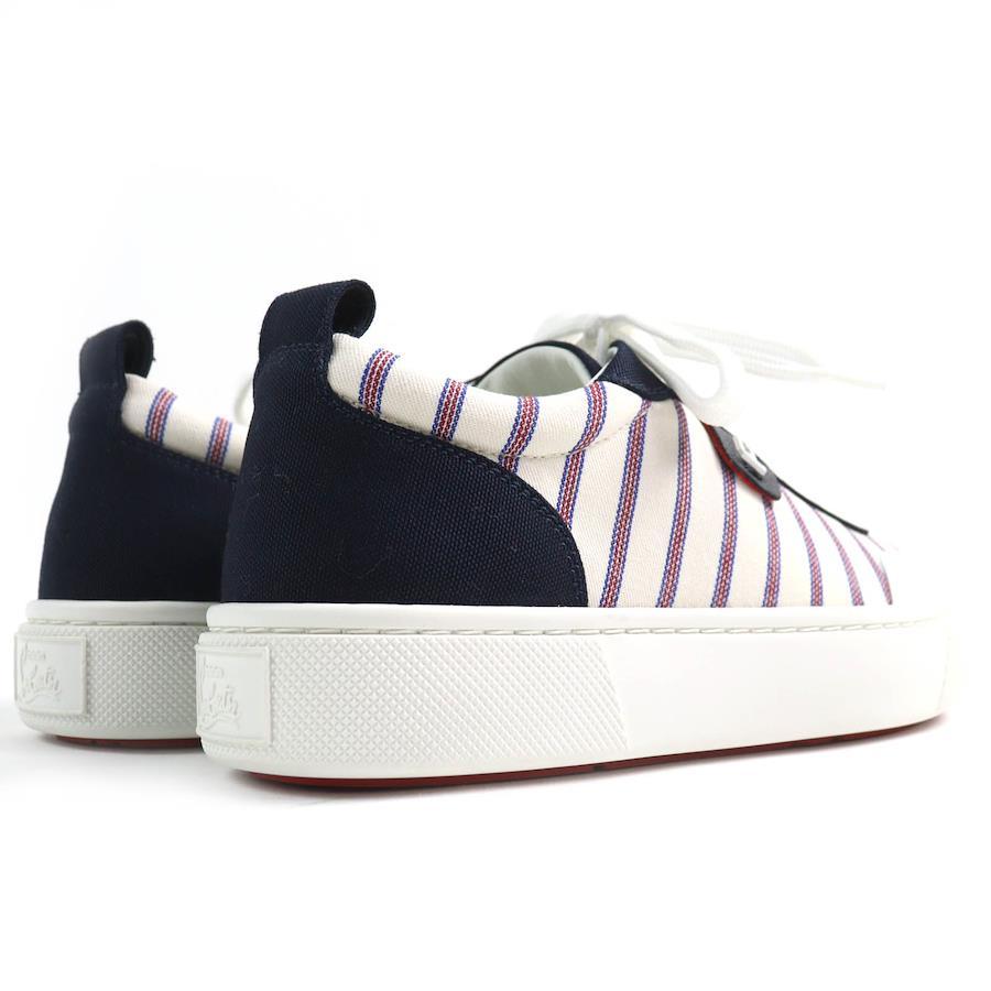 Unused Christian Louboutin HAPPYRUI striped canvas and leather low-top sneakers in beige, navy, red, and white. Size 36.5. Made in Italy. Recommended. Pre-owned.