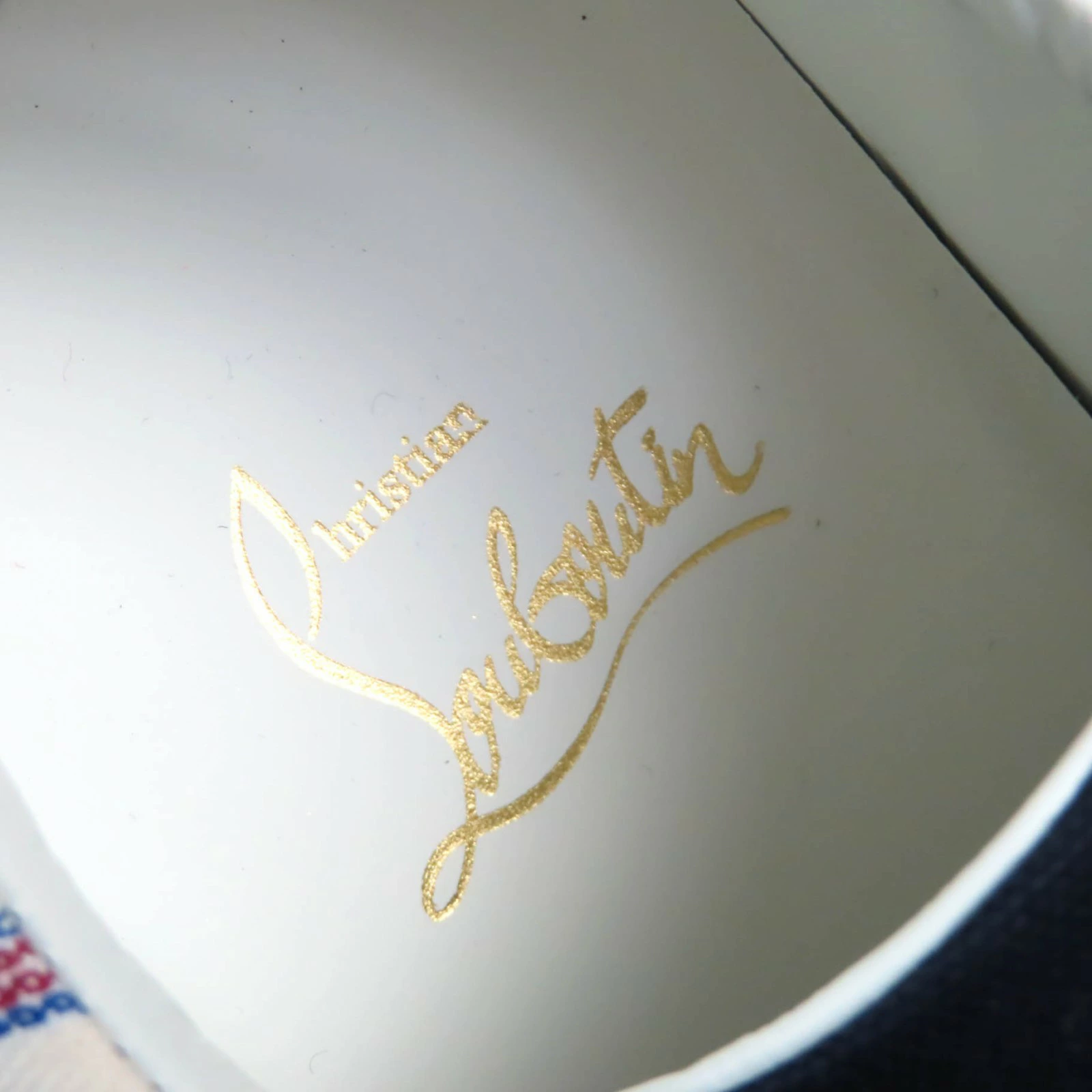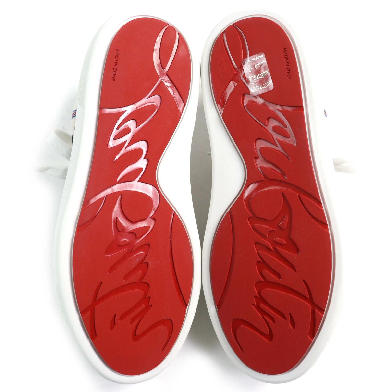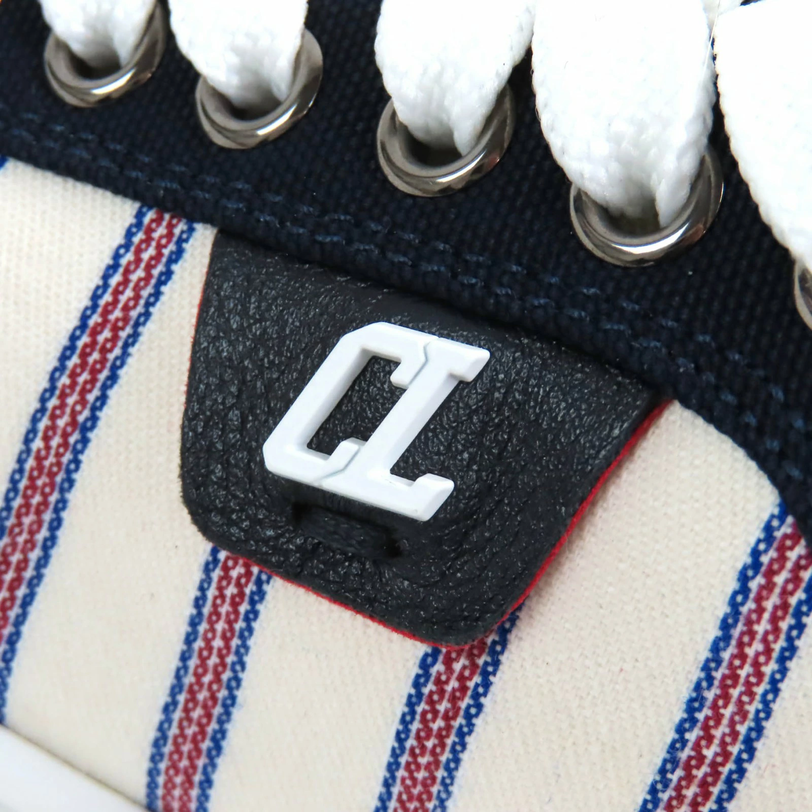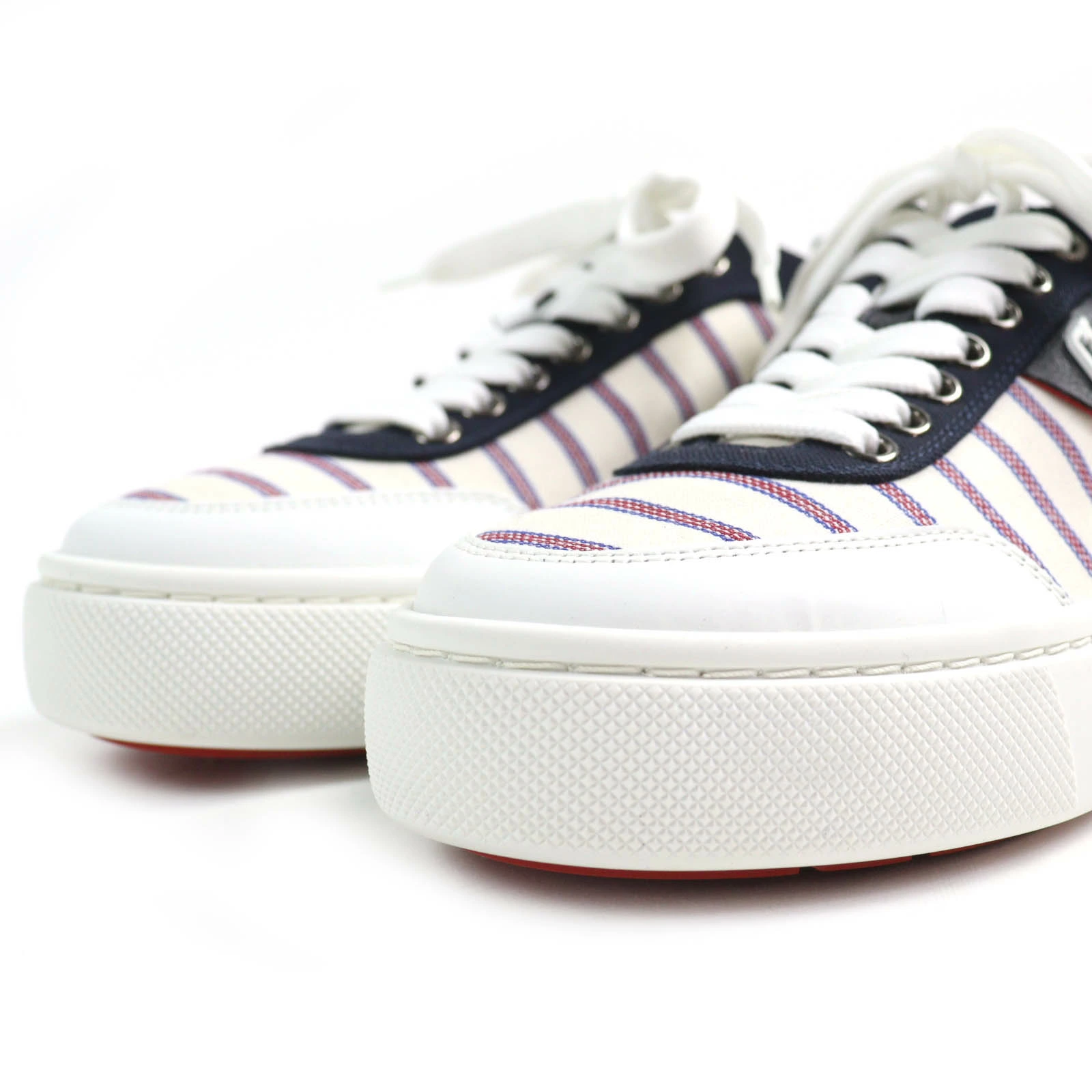 Unused Christian Louboutin HAPPYRUI striped canvas and leather low-top sneakers in beige, navy, red, and white. Size 36.5. Made in Italy. Recommended. Pre-owned.