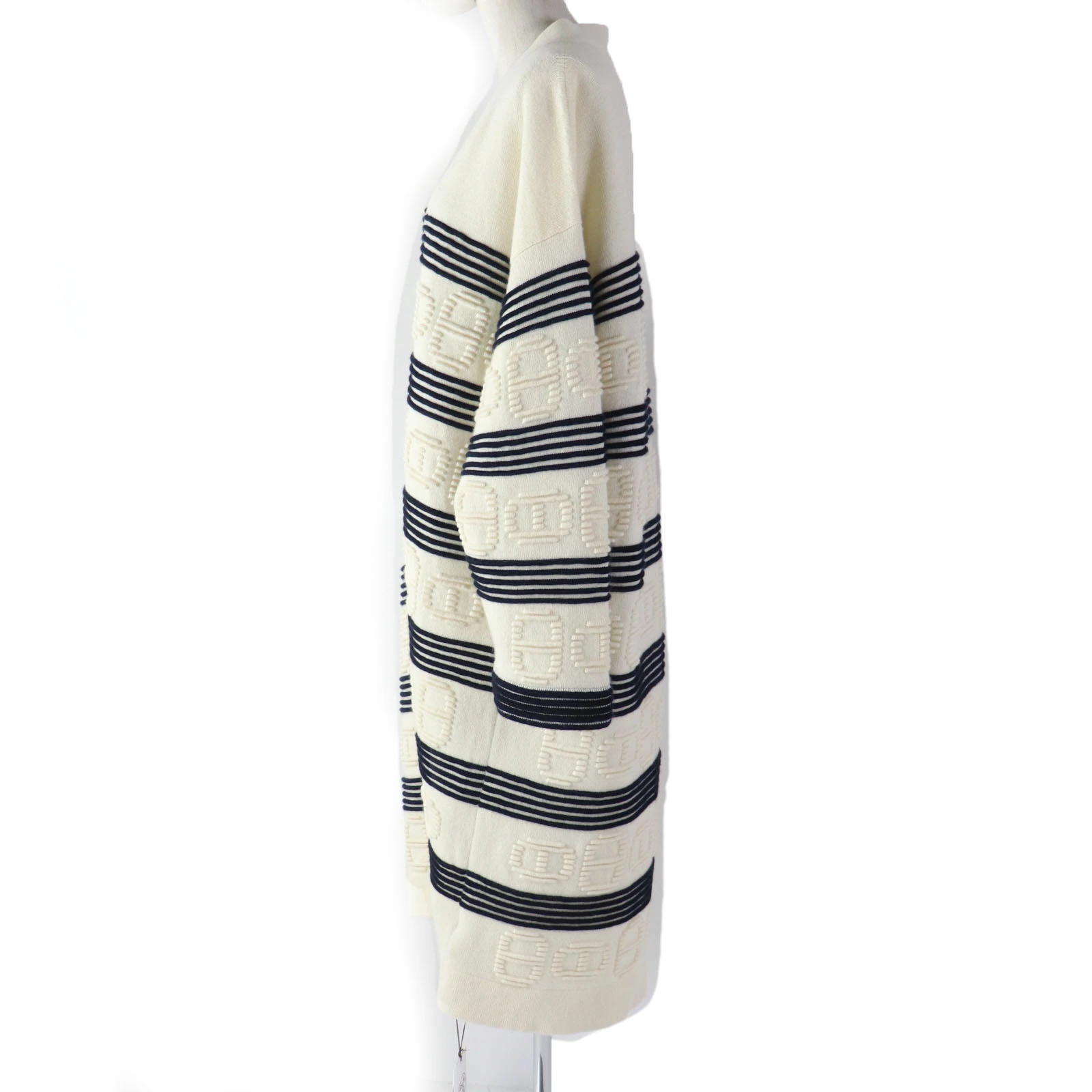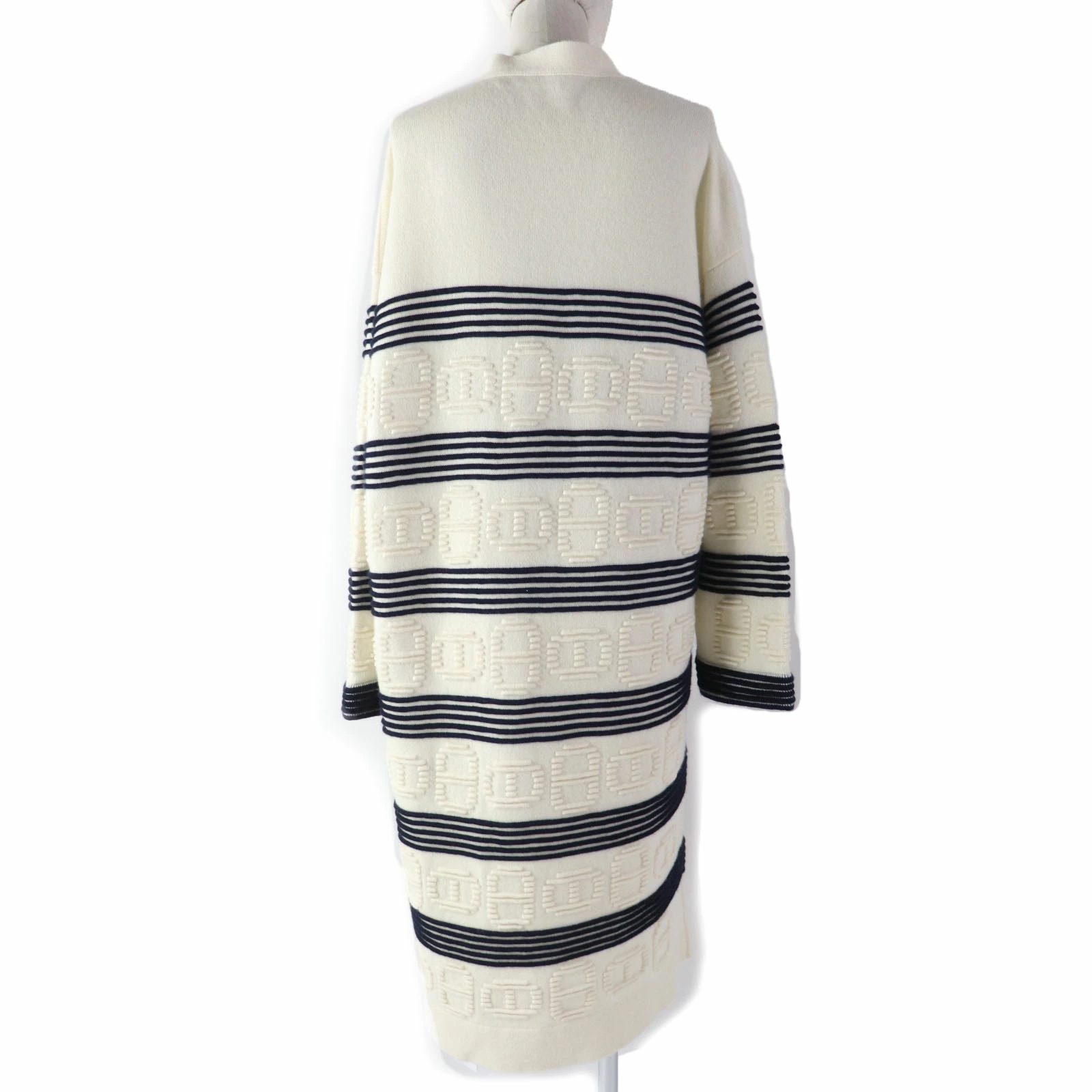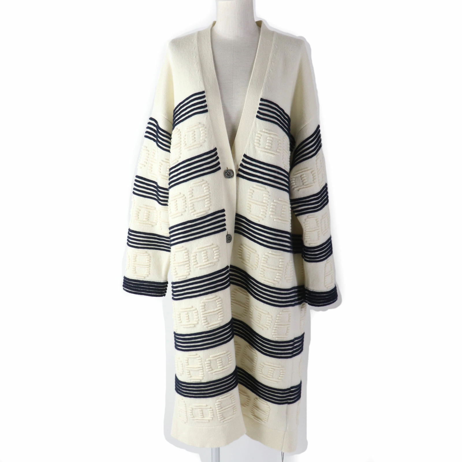 Unused HERMES 2023 3E2102D2 Cashmere and Cotton Chaine d'Ancre Pattern Long Sleeve Cardigan with Serie Buttons, Ivory and Navy, Size 38, Hanger Included, Made in Italy, Authentic, Women's [Pre-owned]