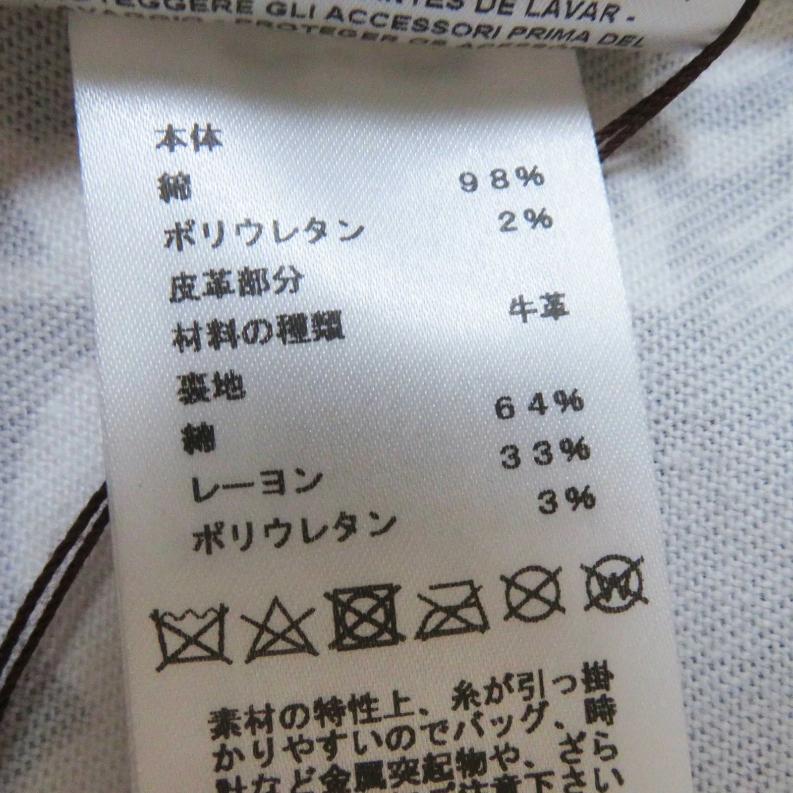| 素材 (material) | 表地:コットン98% :ポリウレタン2% 裏地:コットン64% :レーヨン33% :ポリウレタン3% 皮革部分:牛革 | ||||||||||||||||