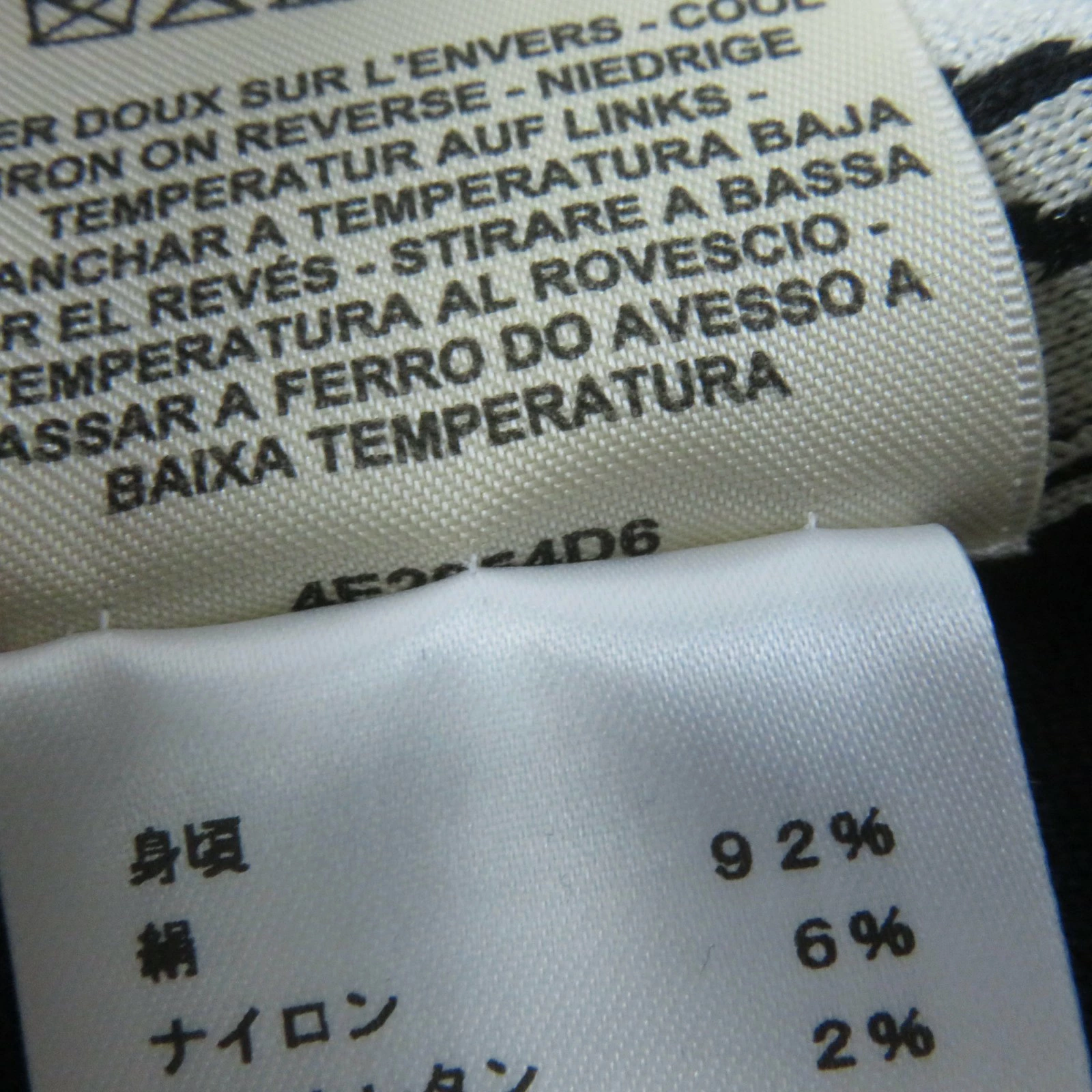 | 素材 (material) | 本体:シルク92% :ナイロン6% :ポリウレタン2% 本体(袖):シルク87% ナイロン10% ポリウレタン3% リブ部分(襟ぐり・裾):シルク74% ナイロン20% ポリウレタン6% リブ部分(袖口):シルク50% ナイロン38% ポリウレタン12% 刺繍部分:レーヨン100% | ||||||||||||||||