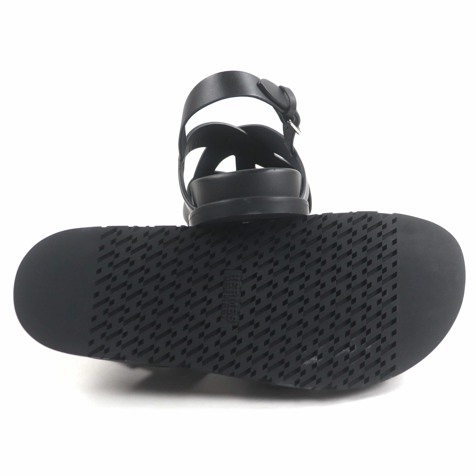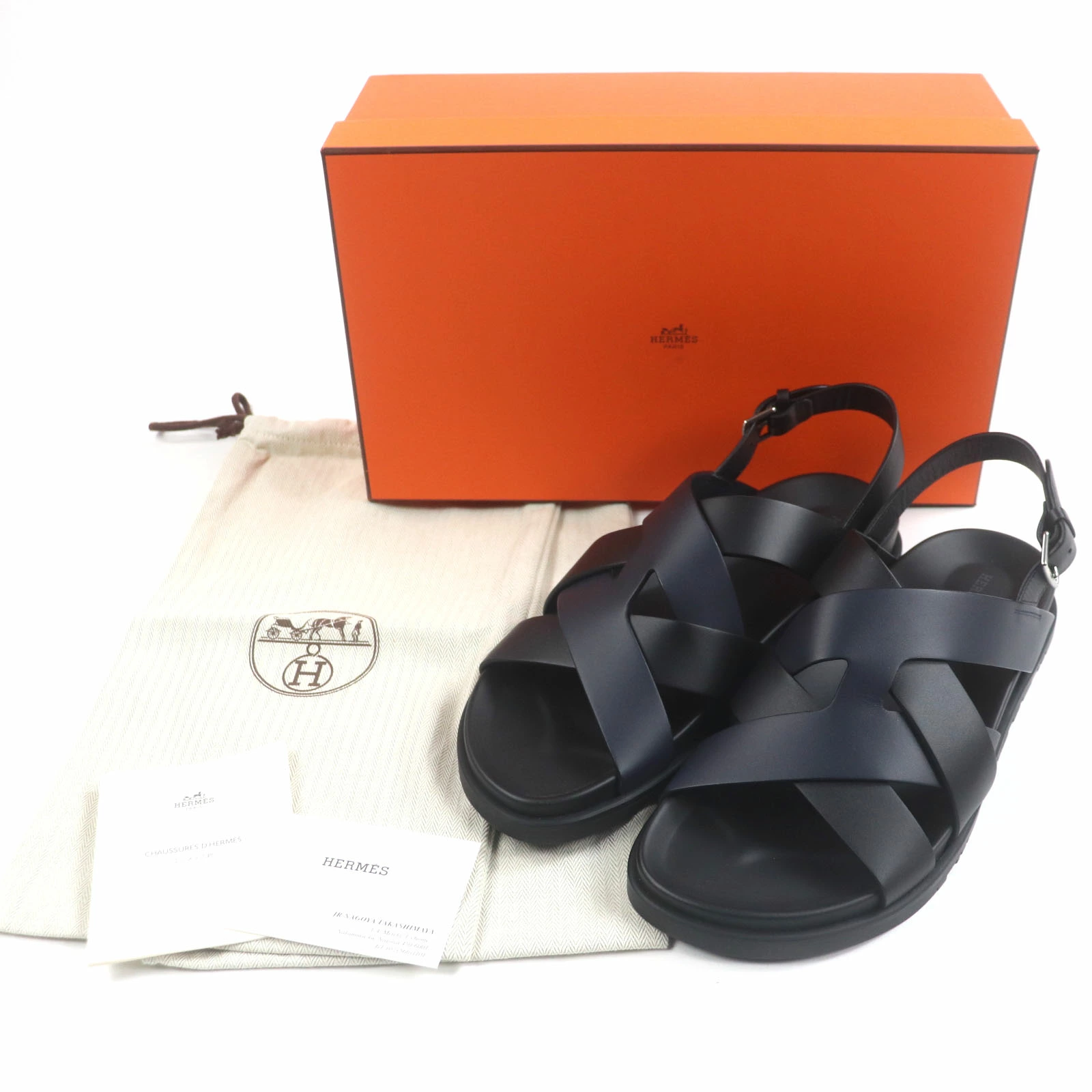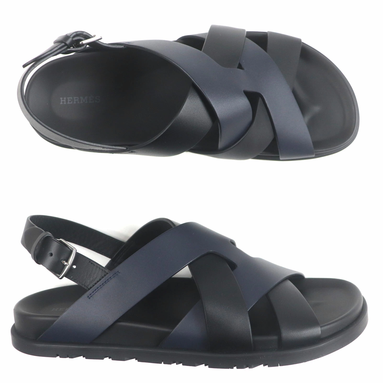 Unused HERMES Hercules leather sandals with silver hardware, cross straps, and an H logo. Size 44, black and navy. Comes with box and dust bag. Made in Italy. Pre-owned.