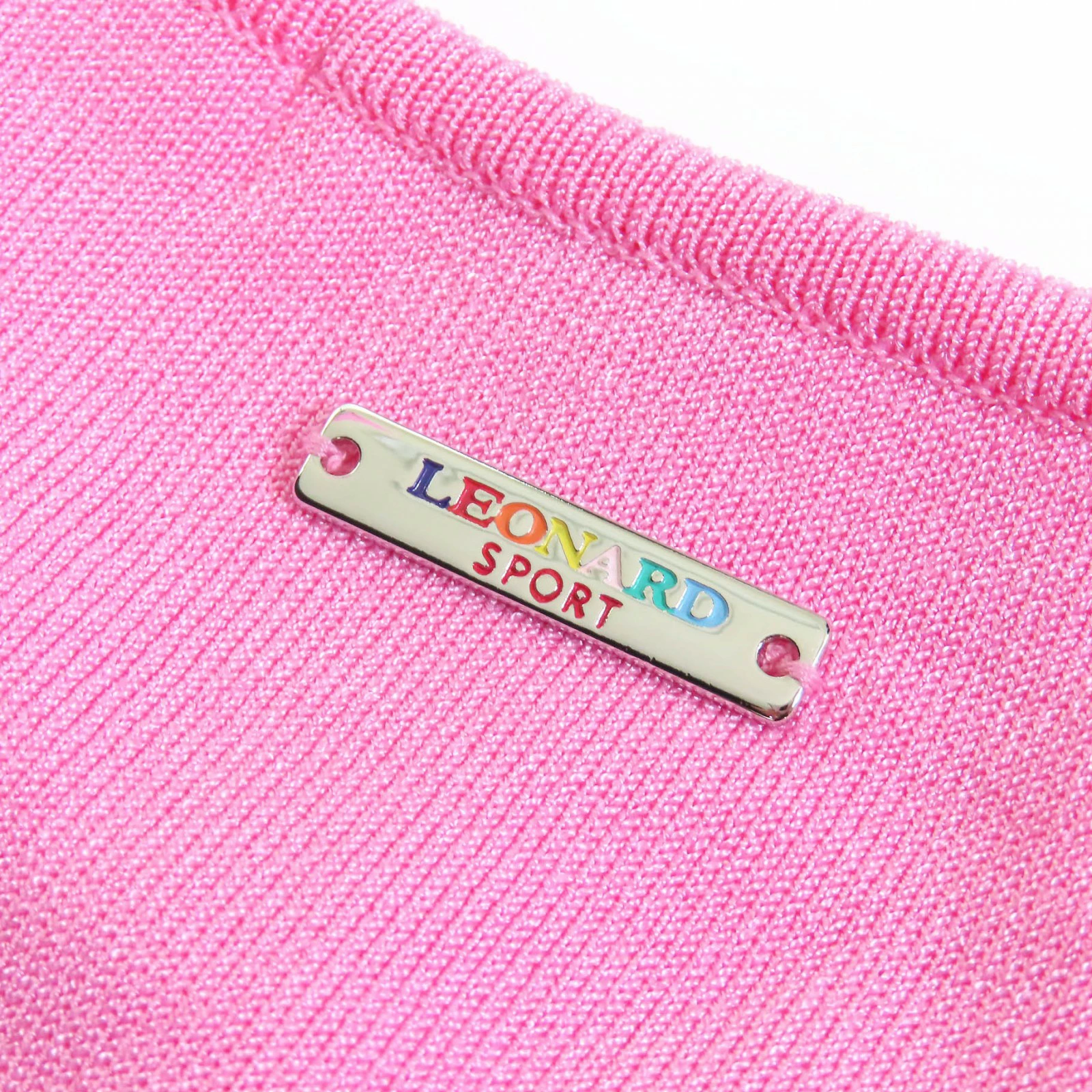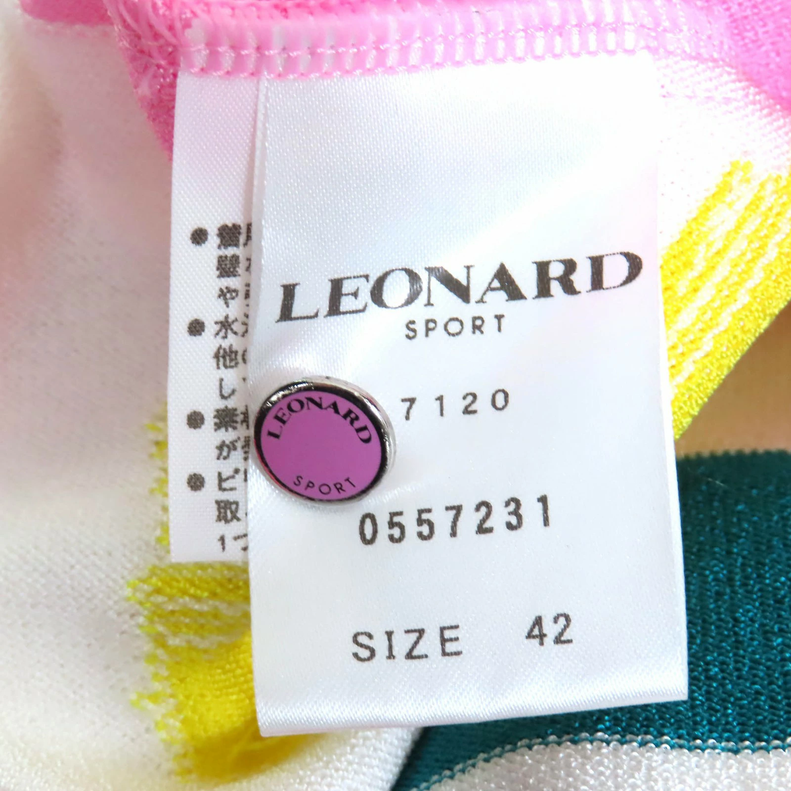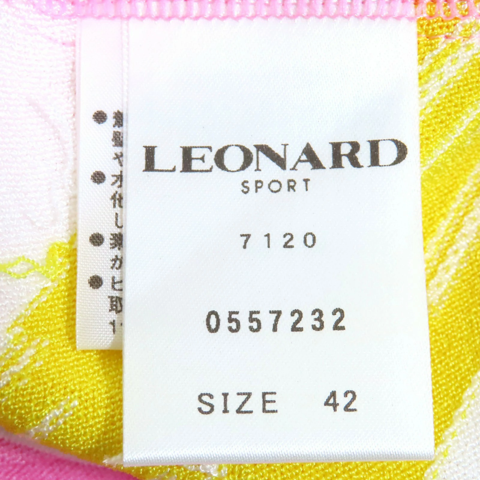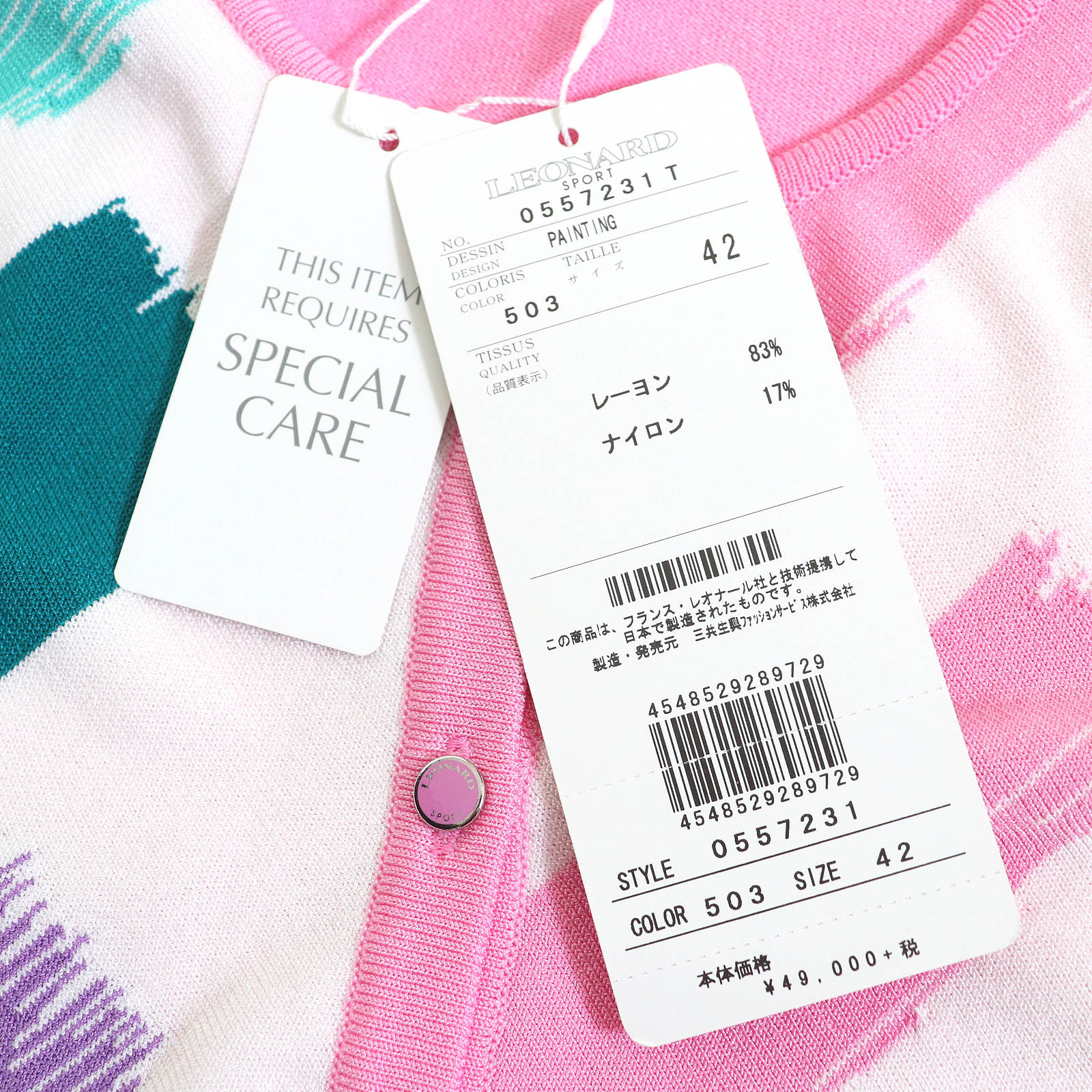 Unused LEONARD SPORT all-over logo button cardigan, short-sleeved cut-and-sew ensemble, pink and multicolor, size 42, made in Japan, authentic, women's. Valued at approximately ¥90,000. [Pre-owned]