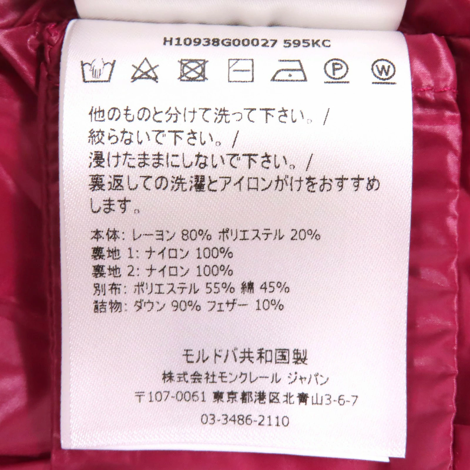 | 素材 (material) | 本体:レーヨン80% :ポリエステル20% 裏地:ナイロン100% :ナイロン100% 一部:ポリエステル55% :コットン45% 中綿:ダウン90% :フェザー10% | ||||||||||||||||