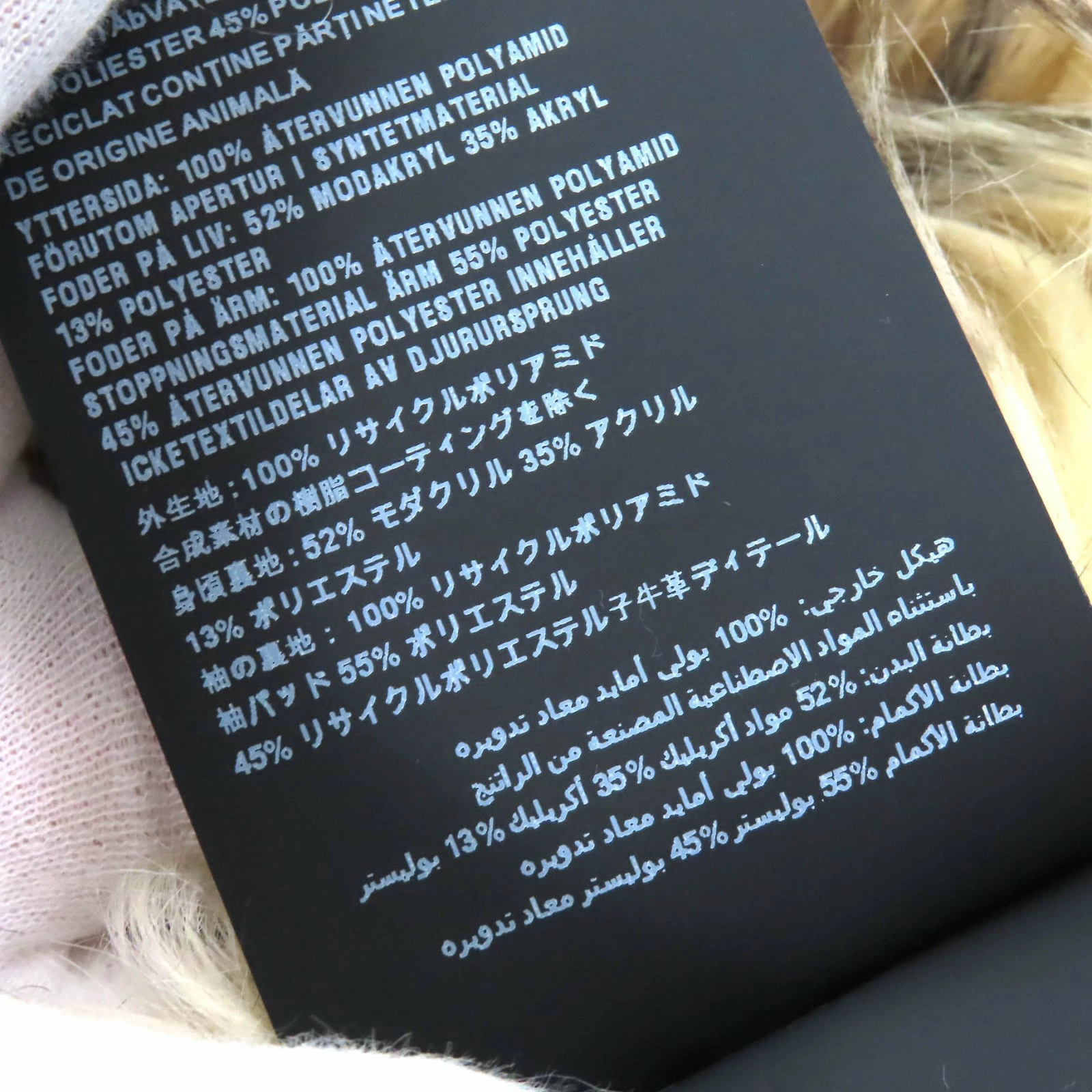 | 素材 (material) | 表地:リサイクルポリアミド100% 裏地:モダクリル52% :アクリル35% :ポリエステル13% 袖裏地:リサイクルポリアミド100% 中綿:ポリエステル55% :リサイクルポリエステル45% 一部:牛革 | ||||||||||||||||