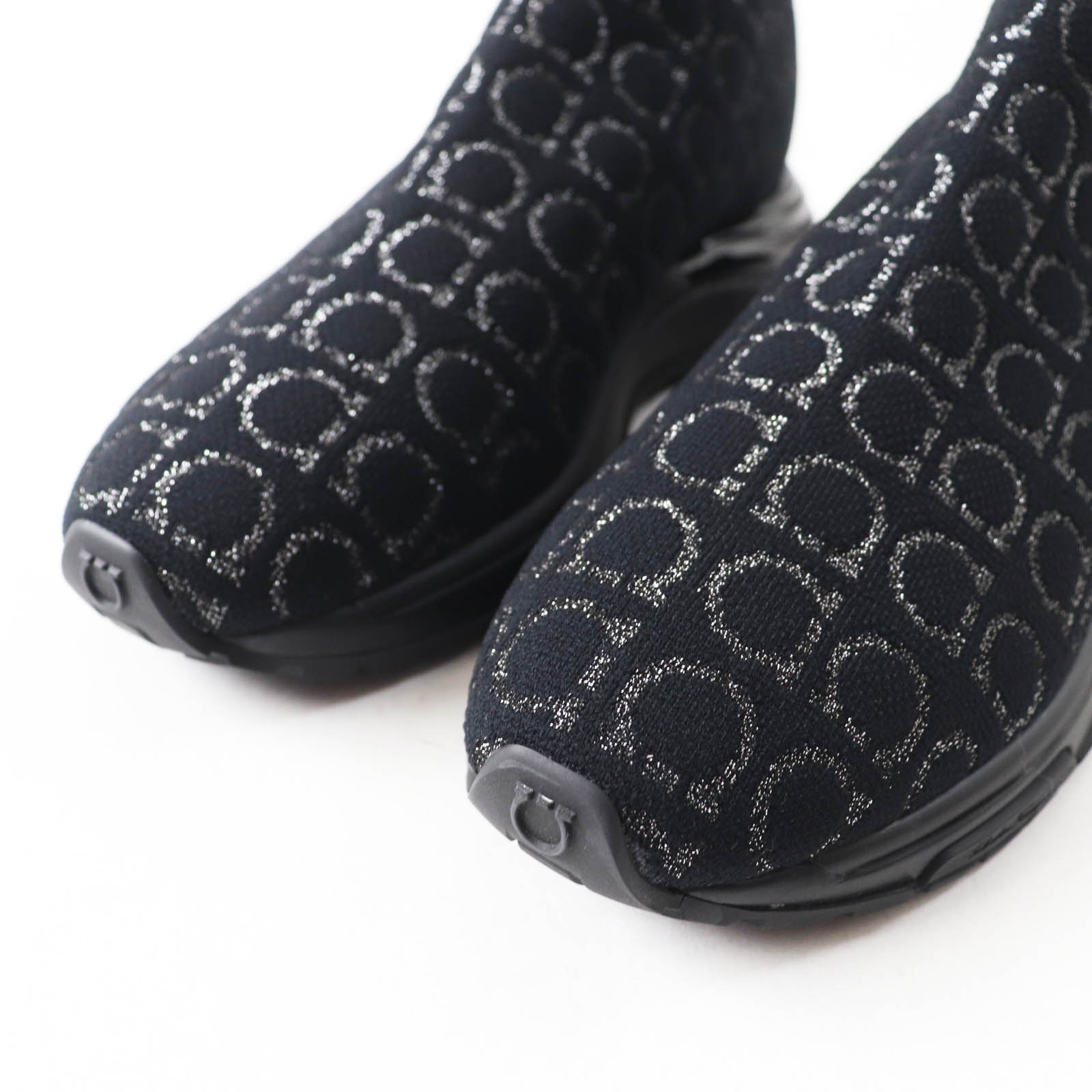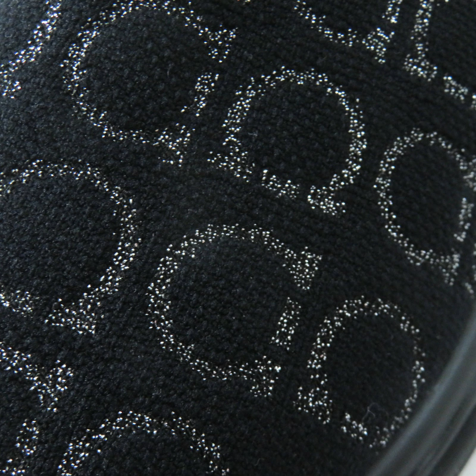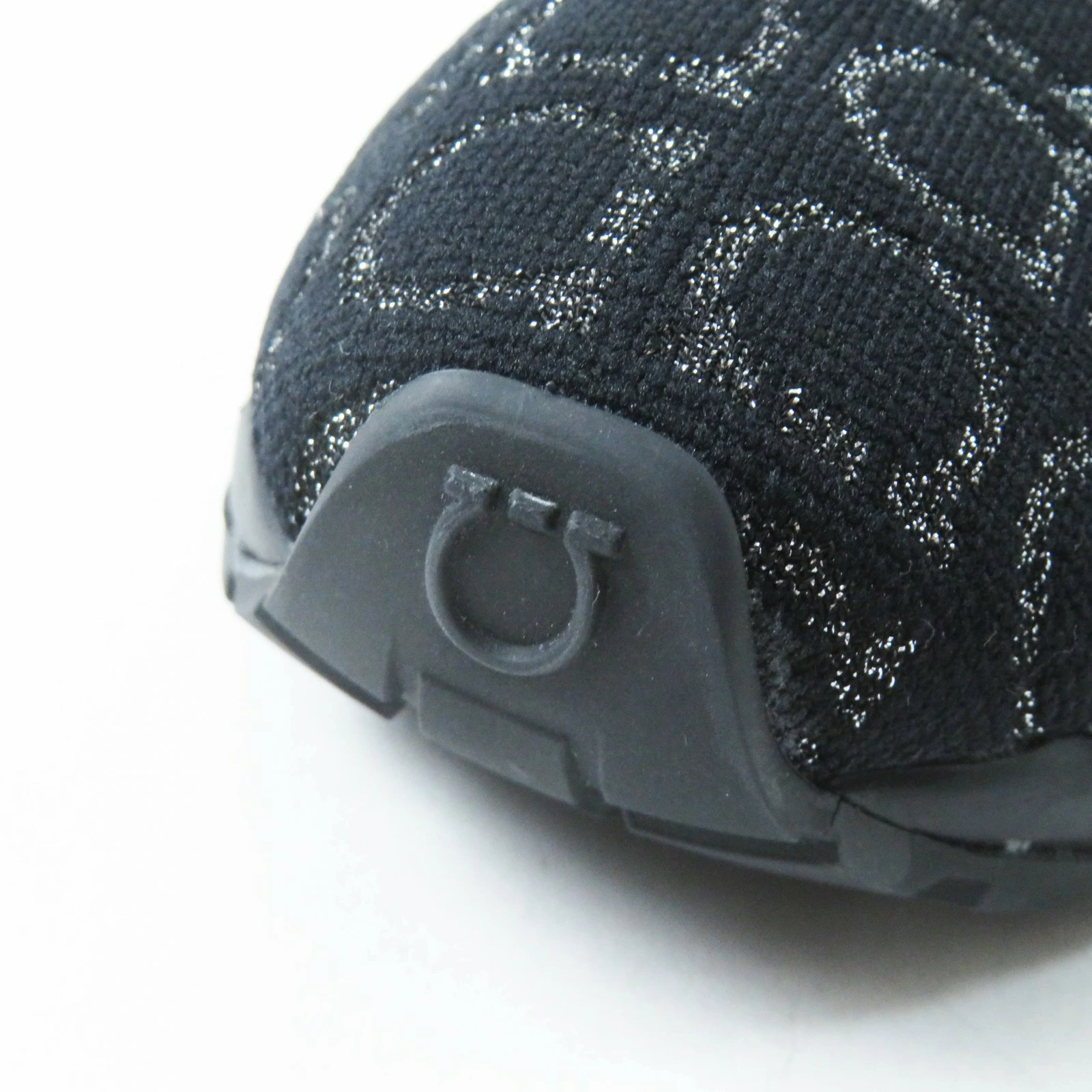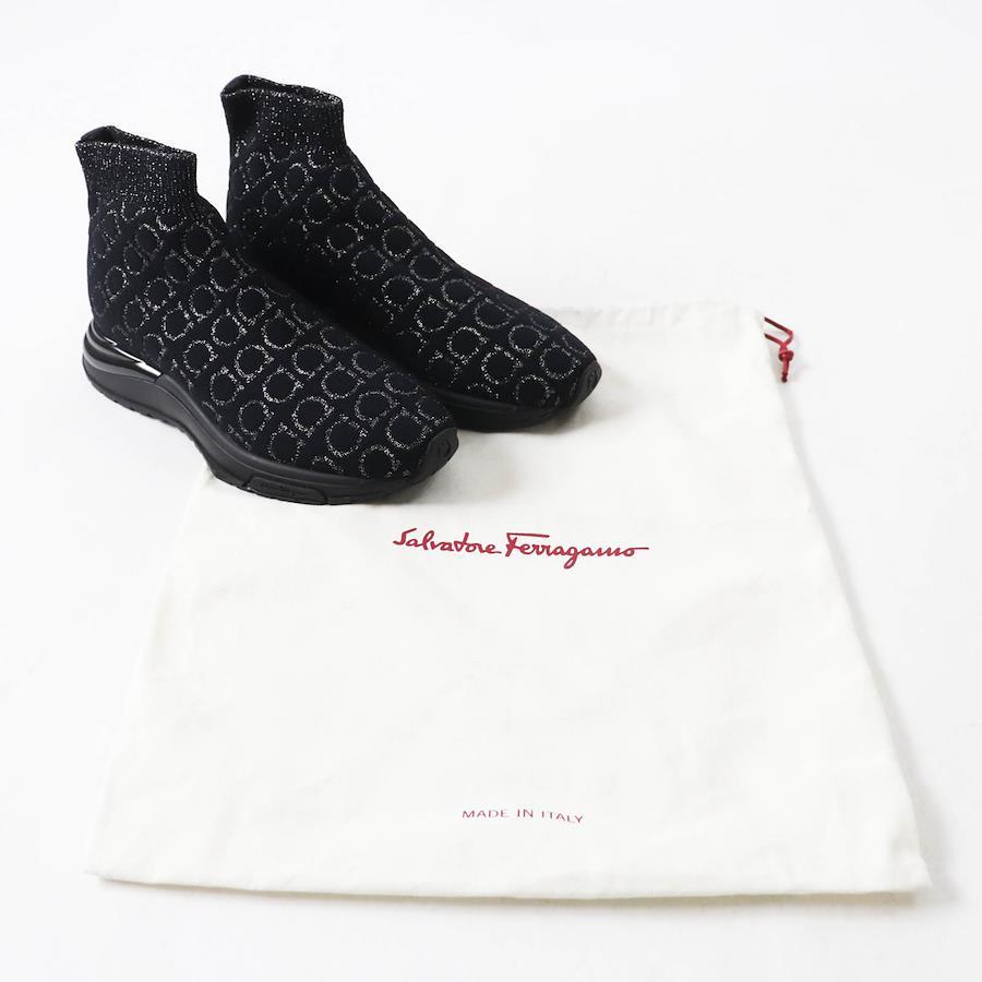 Unused Salvatore Ferragamo Gancini all-over knit sock sneakers, black and silver, size 5.5, with dust bag, made in Italy. Pre-owned.
