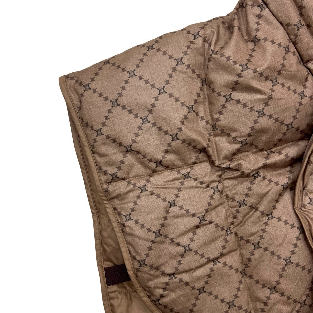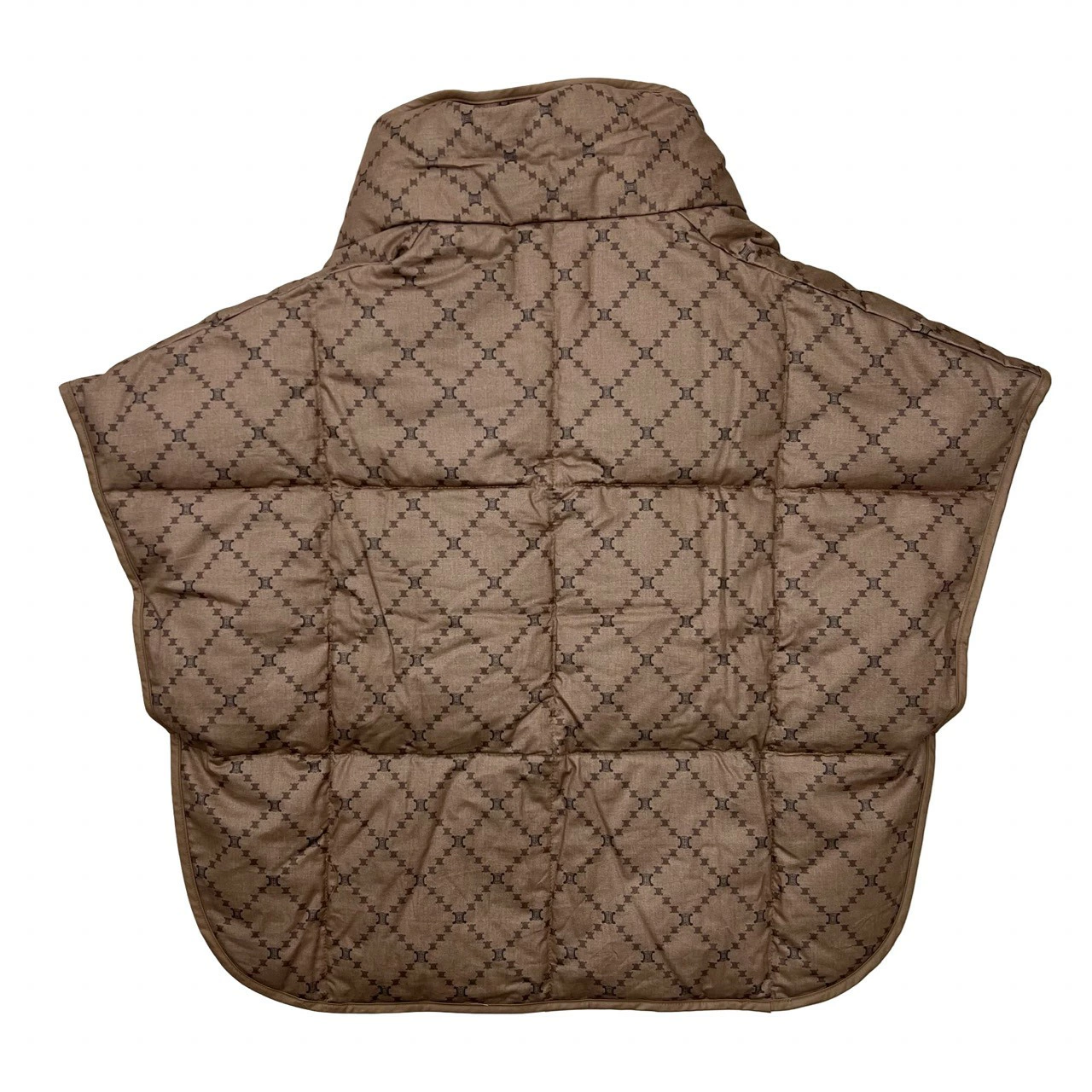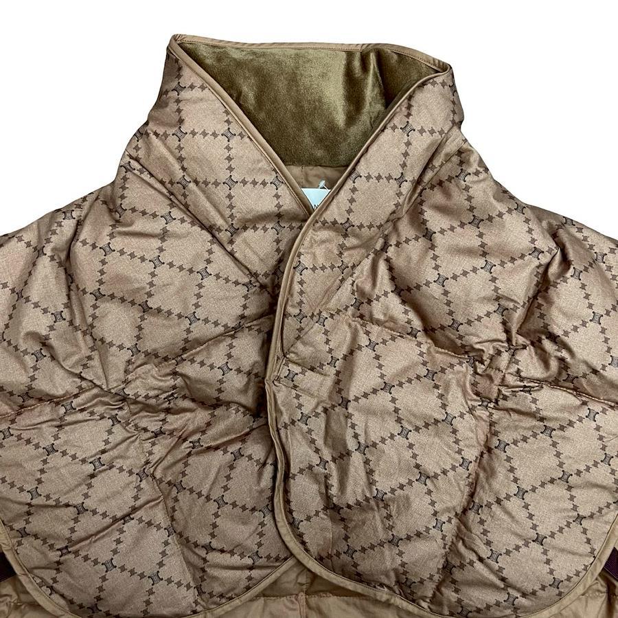 Unused, stored, rare Celine Macadam Blason Triomphe print cotton, polyester, down, and feather poncho, brown, item number 26405. [Pre-owned]