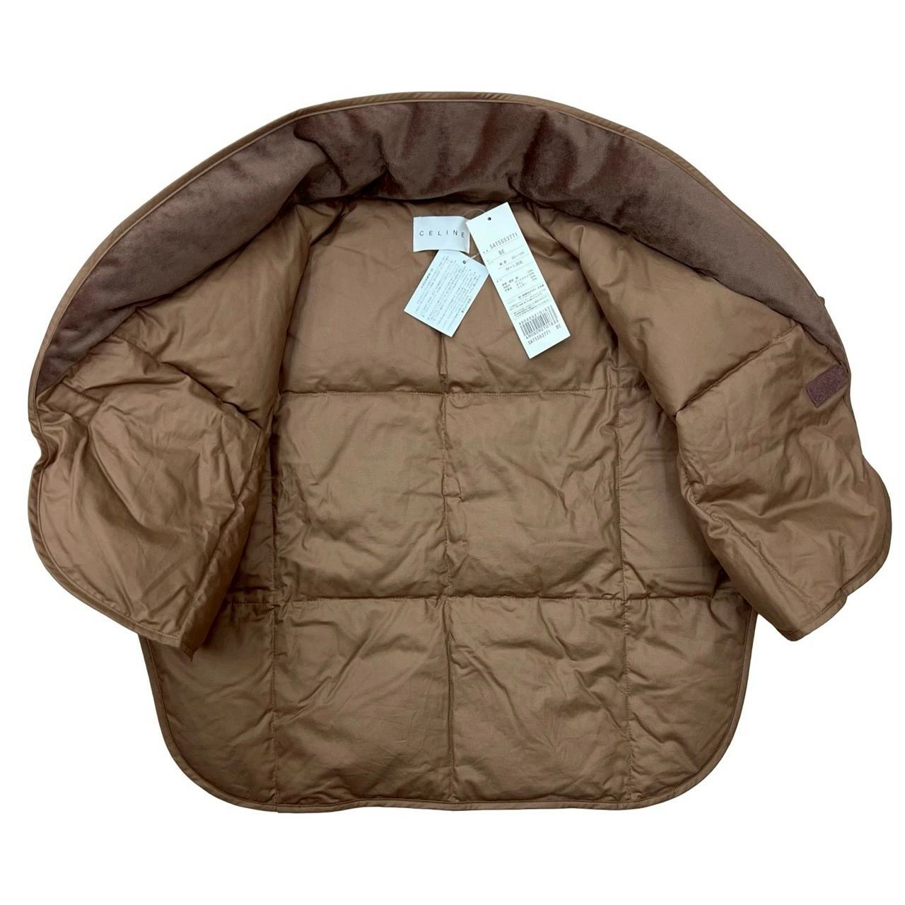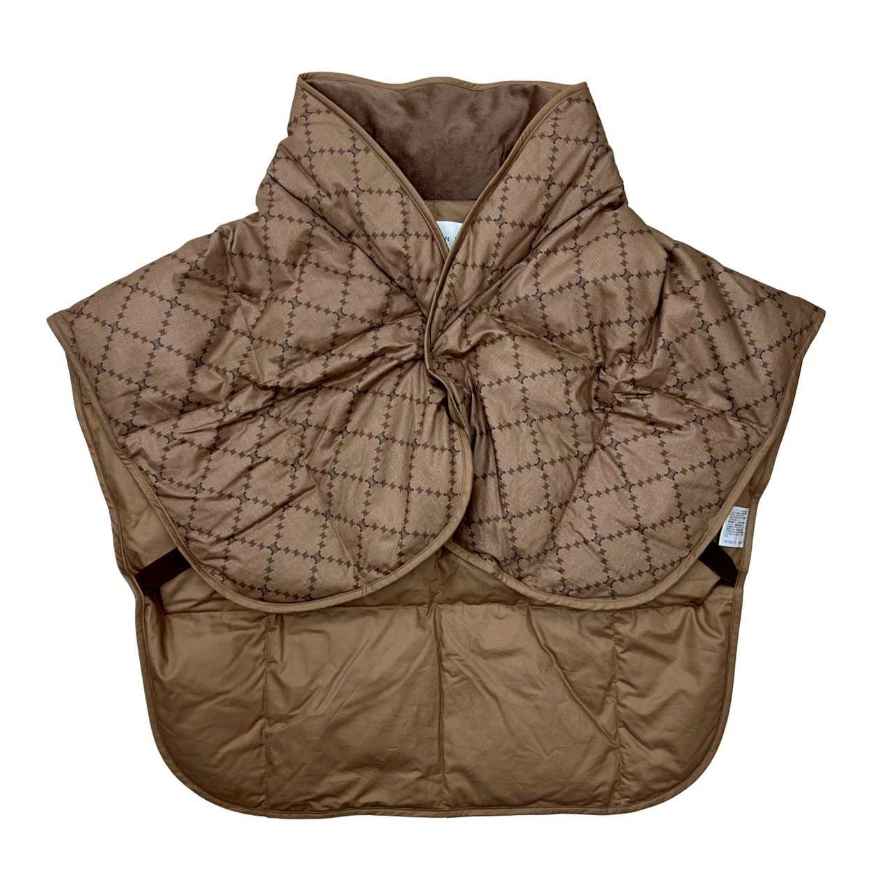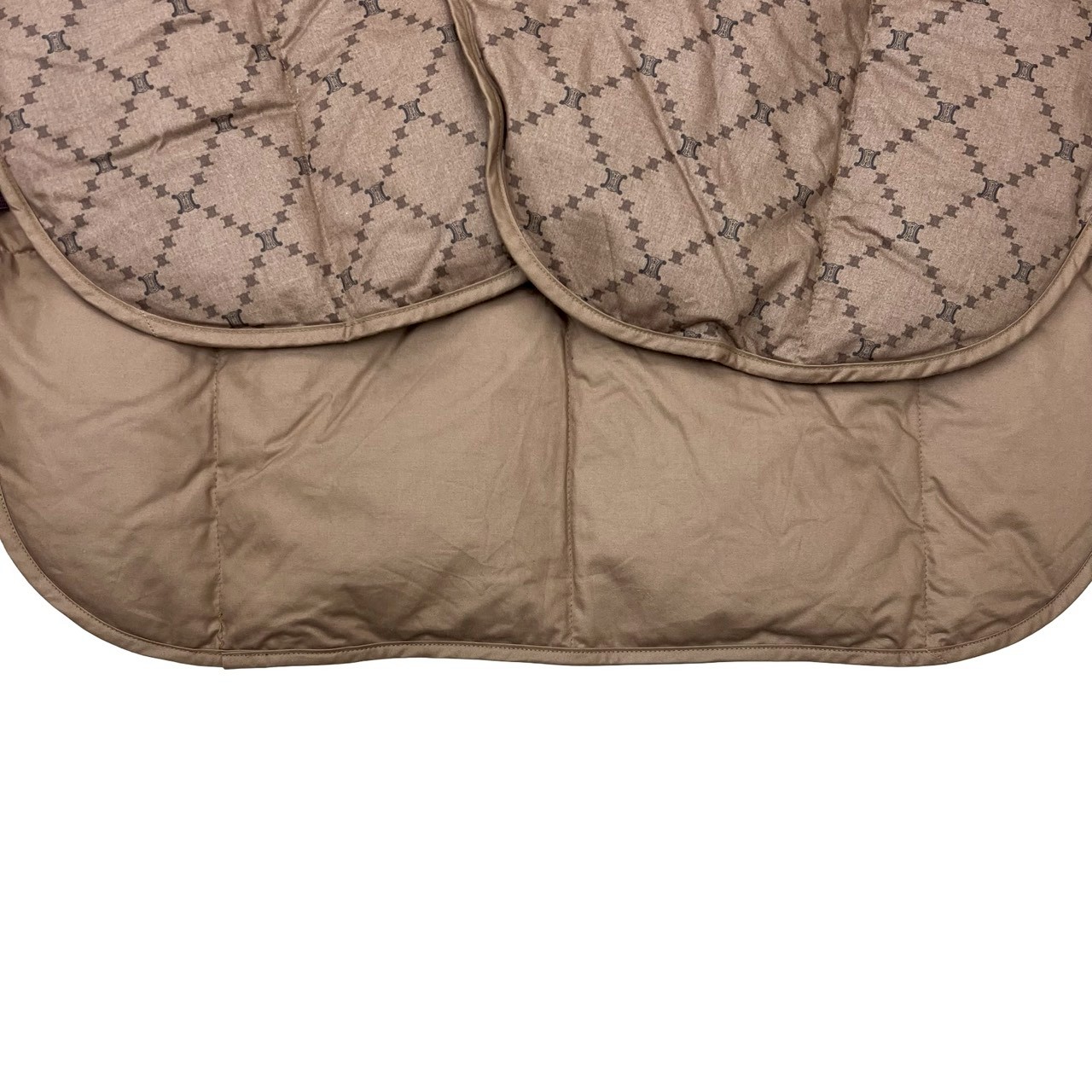Unused, stored, rare Celine Macadam Blason Triomphe print cotton, polyester, down, and feather poncho, brown, item number 26405. [Pre-owned]