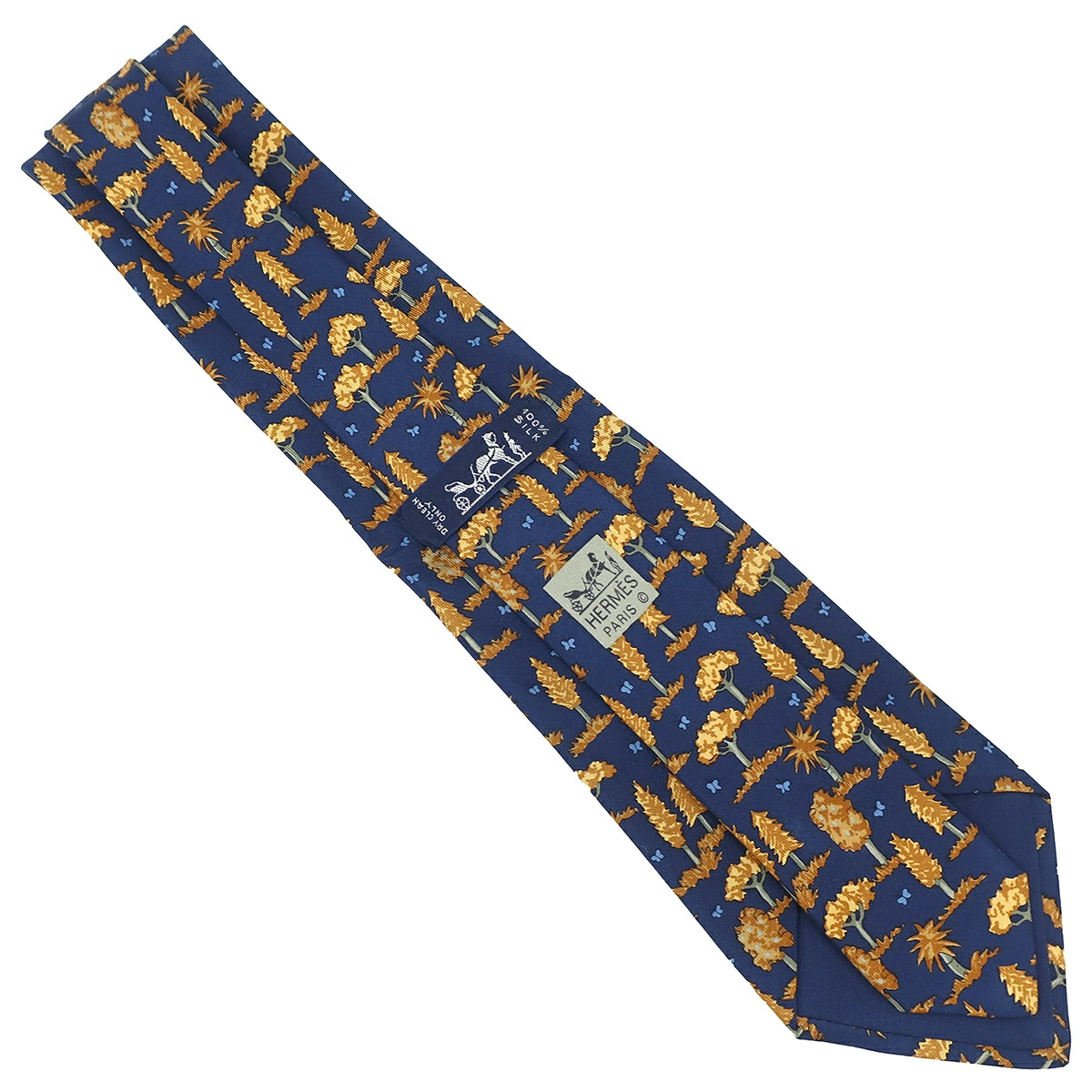 エルメス HERMES 植物柄 8.5cm ネクタイ シルク ネイビー×オレンジ 紺 黄色 茶 木 - メンズ定番 人気 美品 【中古】
