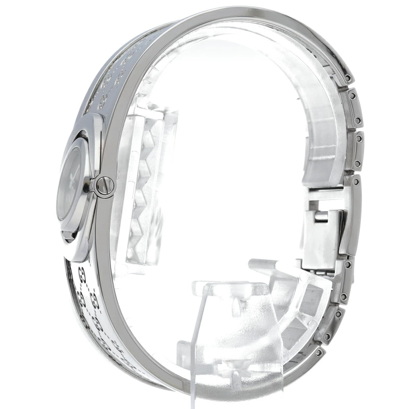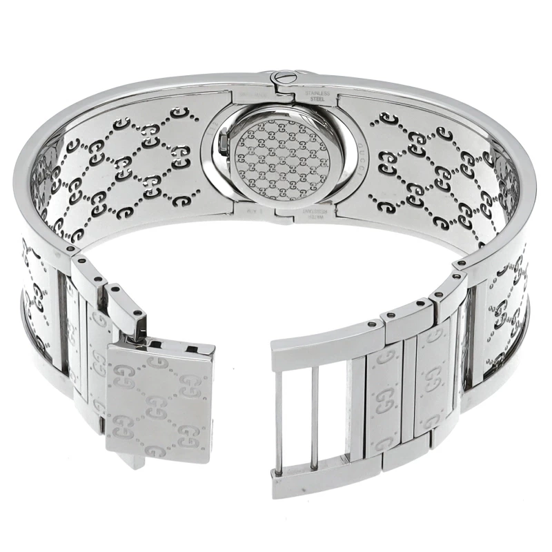 | GGロゴが満遍なくちりばめられたバングルに、時計部分をくるりと回転させるとフェイスが内側に隠れGG柄が刻印された裏蓋が顔を出します。幅広のバングルはブレスレット感覚で着けることができるお洒落なシリーズです。112/YA112 |