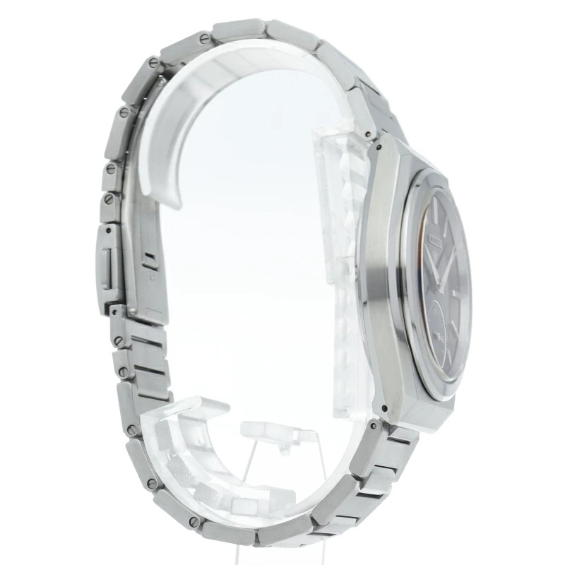 | 自社開発の新型機械式ムーブメントCal.0200は、高精度と審美性を兼ね備えたムーブメントです。ラグのない大胆な面構成のケースとそこから繋がるバンドは、ステンレスの無垢素材を活かした粗目のヘアラインとミラーでシャープに仕上げました。特に装着時には、ケースとバンドが放つ閃光が存在感を創出します。 |