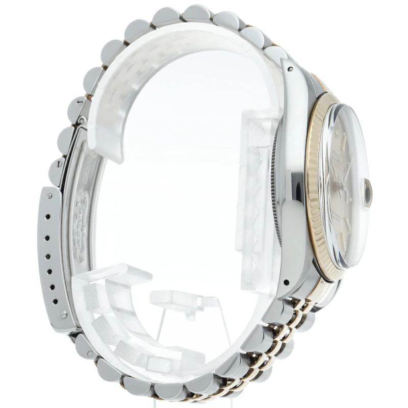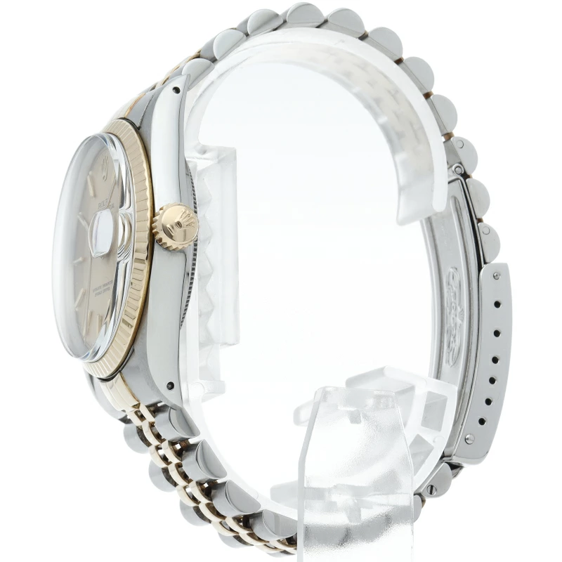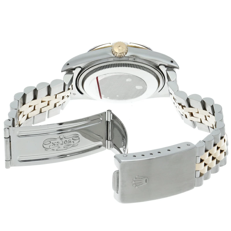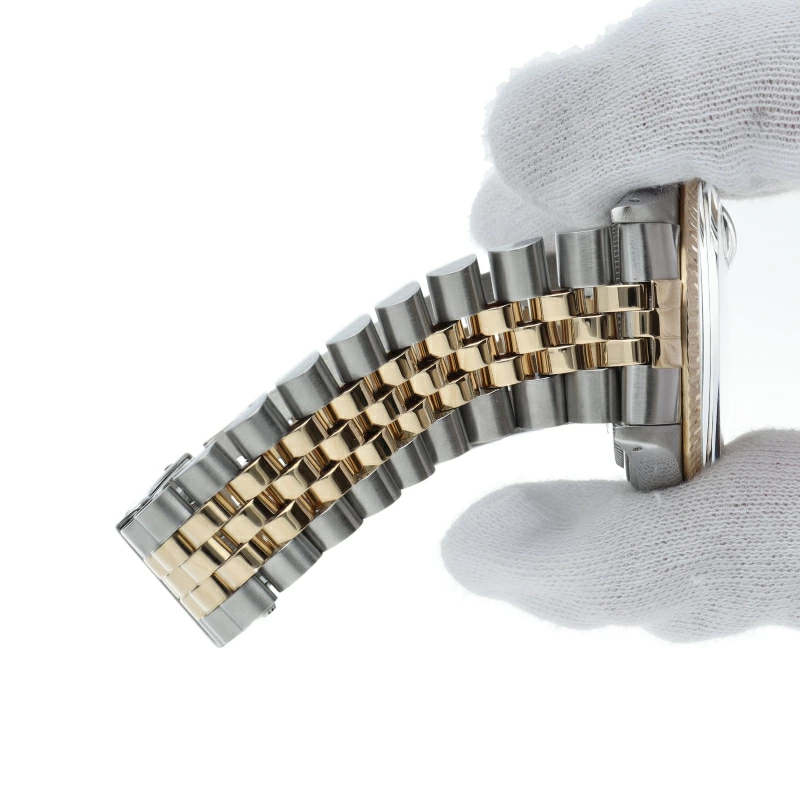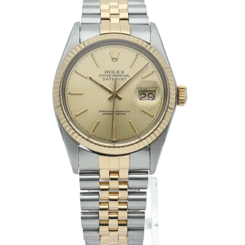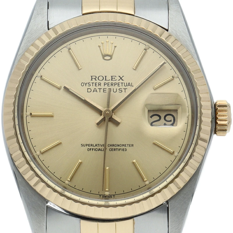 | ロレックスドレスウォッチの王道「デイトジャスト」。イエローゴールドとステンレスの組み合わせが高級感を感じさせる1本です。プラスチック風防仕様。 |