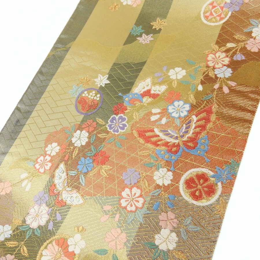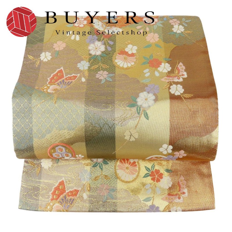 | 品名 | 【中古】 袋帯 道長取りに花と縞 吉祥文様 正絹(金銀糸除く) ゴールド フォーマル 礼装 お祝い レディース 女性 |