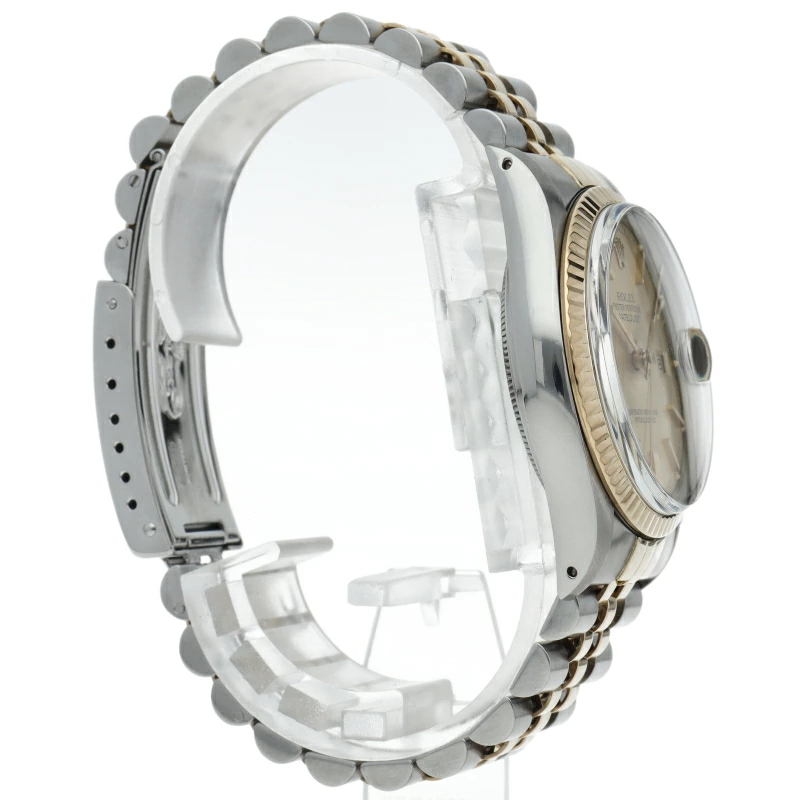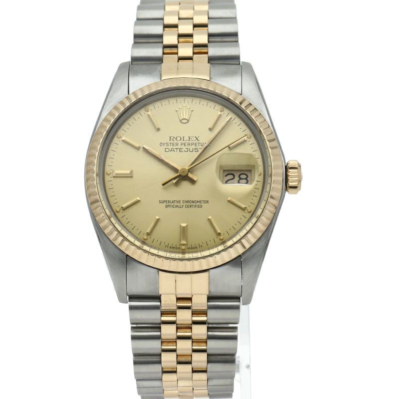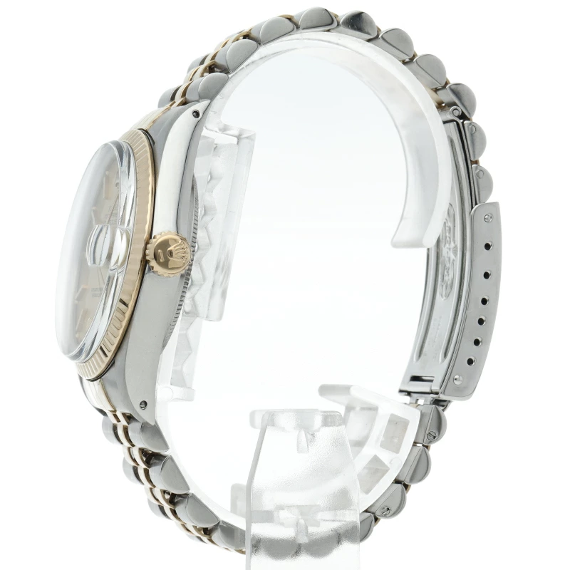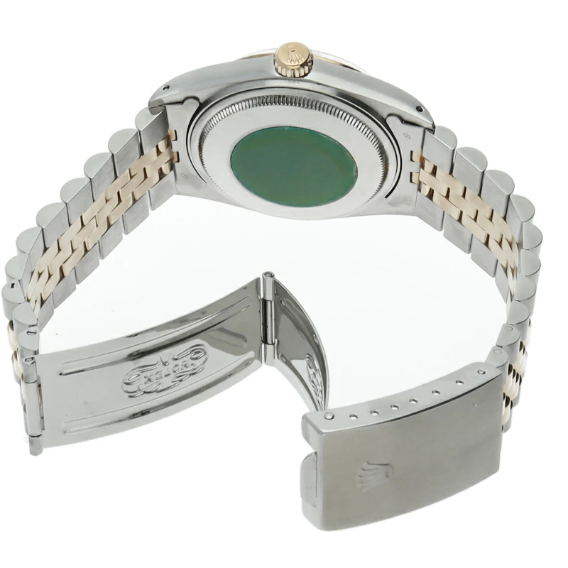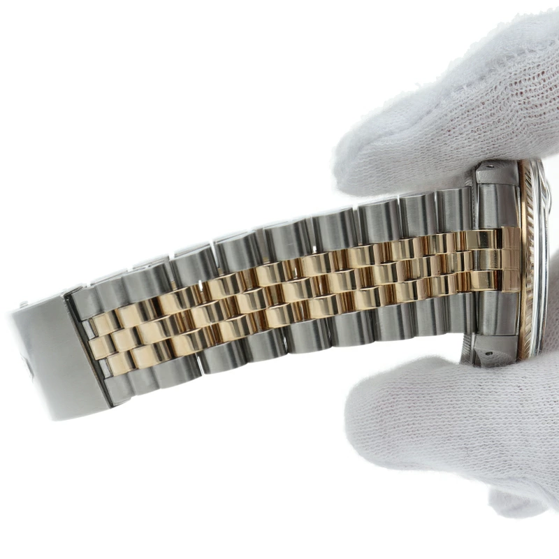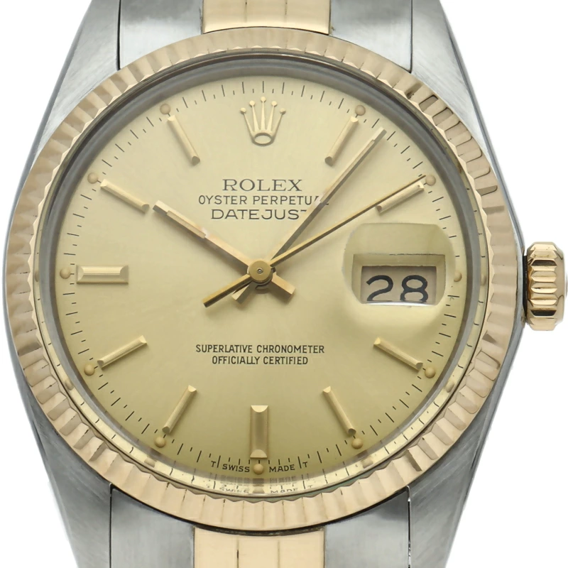 | ロレックスドレスウォッチの王道「デイトジャスト」。イエローゴールドとステンレスの組み合わせが高級感を感じさせる1本です。プラスチック風防仕様。 |