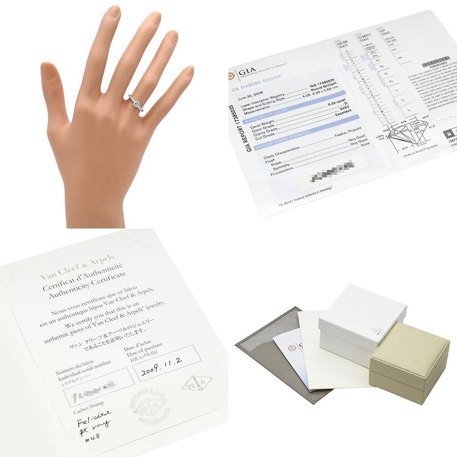 Van Cleef & Arpels Ring, Pt950, Platinum Silver, 1 Diamond, Size 8, #48(JP8), Women's, [Boxed], Classic, Popular, Excellent Condition, Pre-ownedBrand: Van Cleef & ArpelsFeaturesColor: Platinum SilverMaterial: Pt950 / DiamondSize: Size 8Ring Maximum Width: 4.4mmRing Inner Diameter: 15.5mm#48(JP8)*The size is measured using our ring stick and may differ from the manufacturer's stated size.Manufacturer's Size: #48 (JP8)Gemstone: 0.32ct DiamondClarity: VVS2Color: DCut: ExcellentPolishing: Very GoodSymmetry: Very GoodFluorescence: NoneDiamond Shape: Round Brilliant CutWeight: 2.2gAccessories: Certificate of Authenticity, Inner Box, Outer Box, Warranty Card (Purchased in Japan in 2009), Leather Case*No accessories other than those listed are included.Rank: A [Overall Condition Details]There is minor damage due to use and storage, but the item is in relatively good condition. *See images and comments.[Condition Details] Pre-owned, in excellent conditionThere are minor scuffs and scratches.