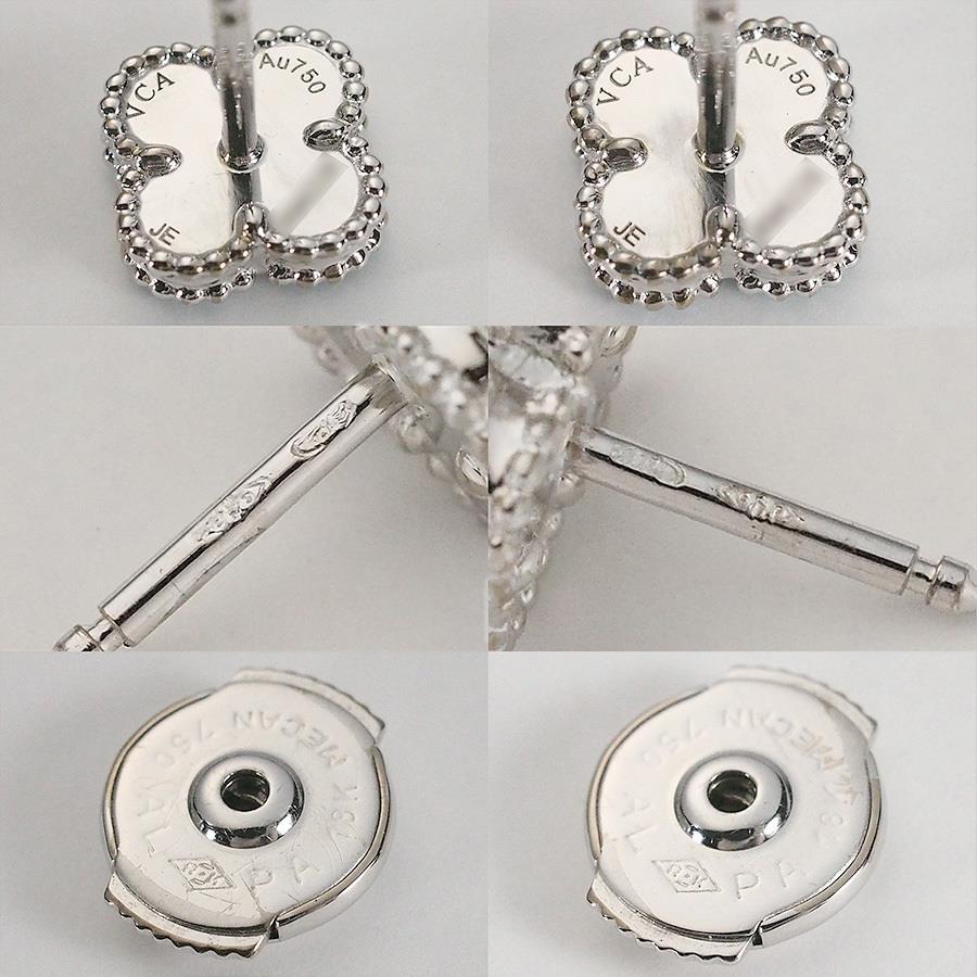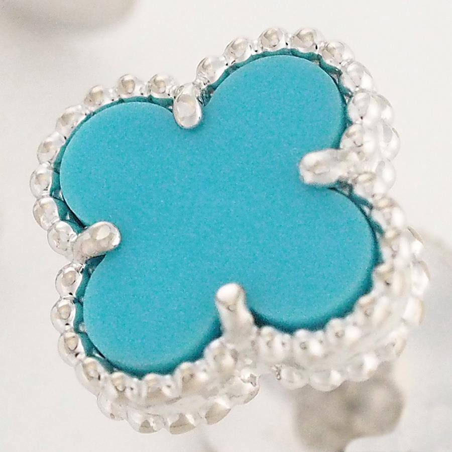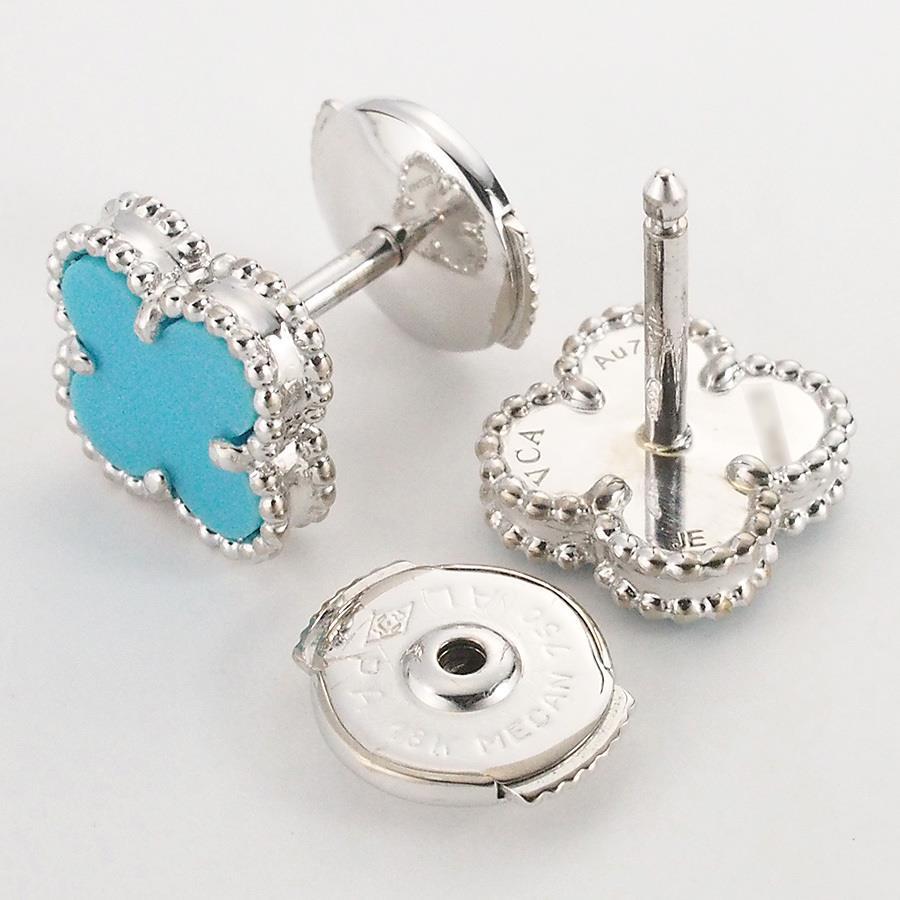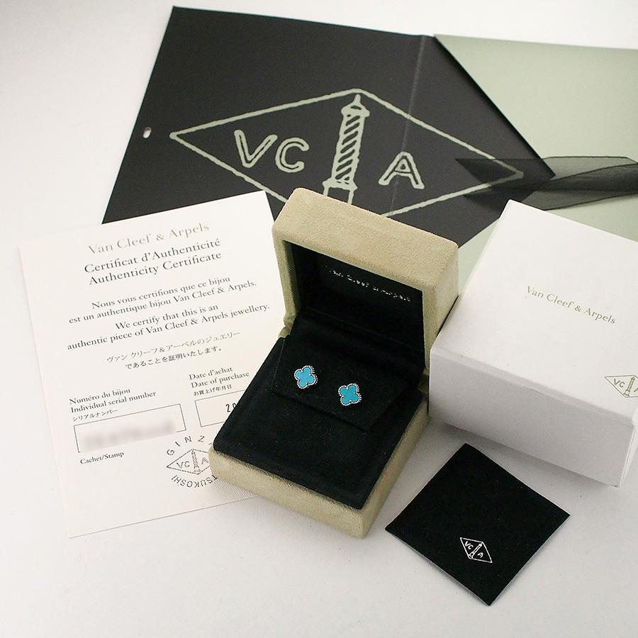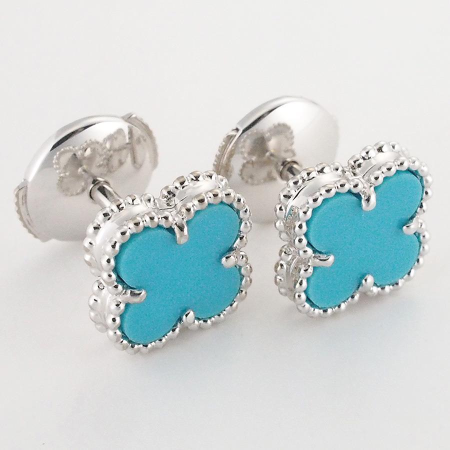 Brand: Van Cleef & ArpelsProduct Name: Sweet Alhambra Turquoise EarringsModel Number: NoneSize: 9.2mm x 9.2mmPost Diameter: Approx. 0.8mmWeight: 2.6g (including backing)Material: 18K White GoldStamp: VCA Au750 Serial Number: PA 18K MEKAN 750 ALSuggested Retail Price: NoneAccessories: Inner box (some scuffs and dirt), outer box, certificate (2015/12 Authentic Japanese Domestic Market)Rank: SACondition/Notes: PolishedIf you have any questions about this product, please contact us via the Q&A form.If the stone size is not specified, it is considered an unknown size due to the lack of engraving.