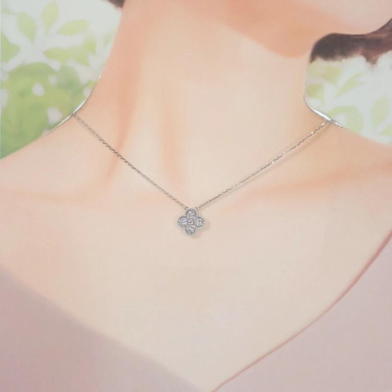 愛と幸運を象徴する四つ葉のクローバーに、ホワイトゴールドの上品な輝きが加わり、気品と優美さを兼ね備えた逸品です。