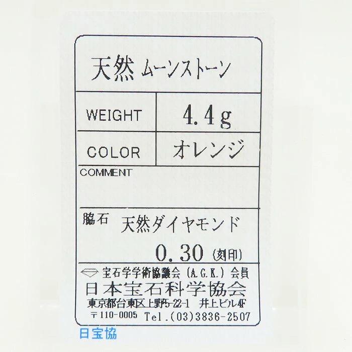 | | 重量 | 4.4g | | 付属品 | ソーティングシート | | 備考 | ダイヤモンド 0.30ct オレンジムーンストーン