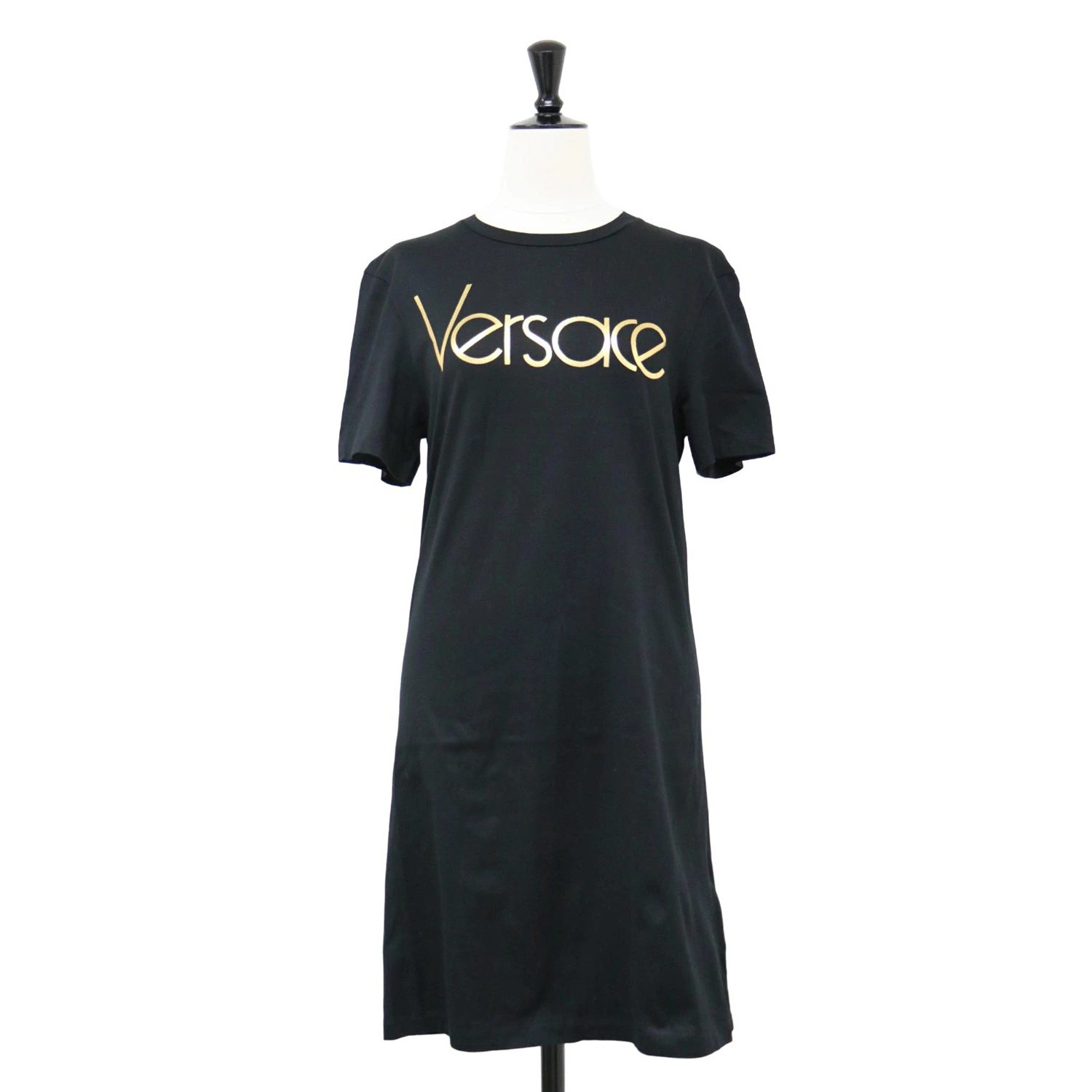 VERSACE Dress in Black and Gold, Size 36 (XXS) / Logo Print T-Shirt Mini Dress / Crew Neck, Short Sleeves, Tight Fit, Cotton / Made in Italy [Women's] [Pre-owned] [Excellent Condition] [K4619]